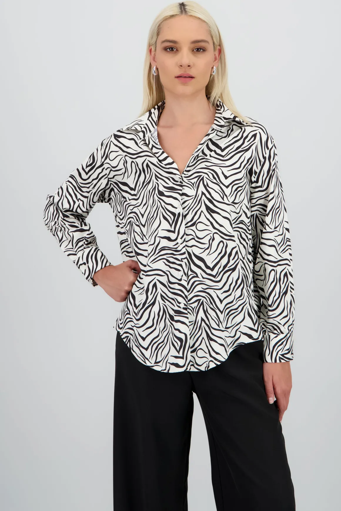 Camisa con diseño de animal print, con corte fluido, manga larga y botones frontales.