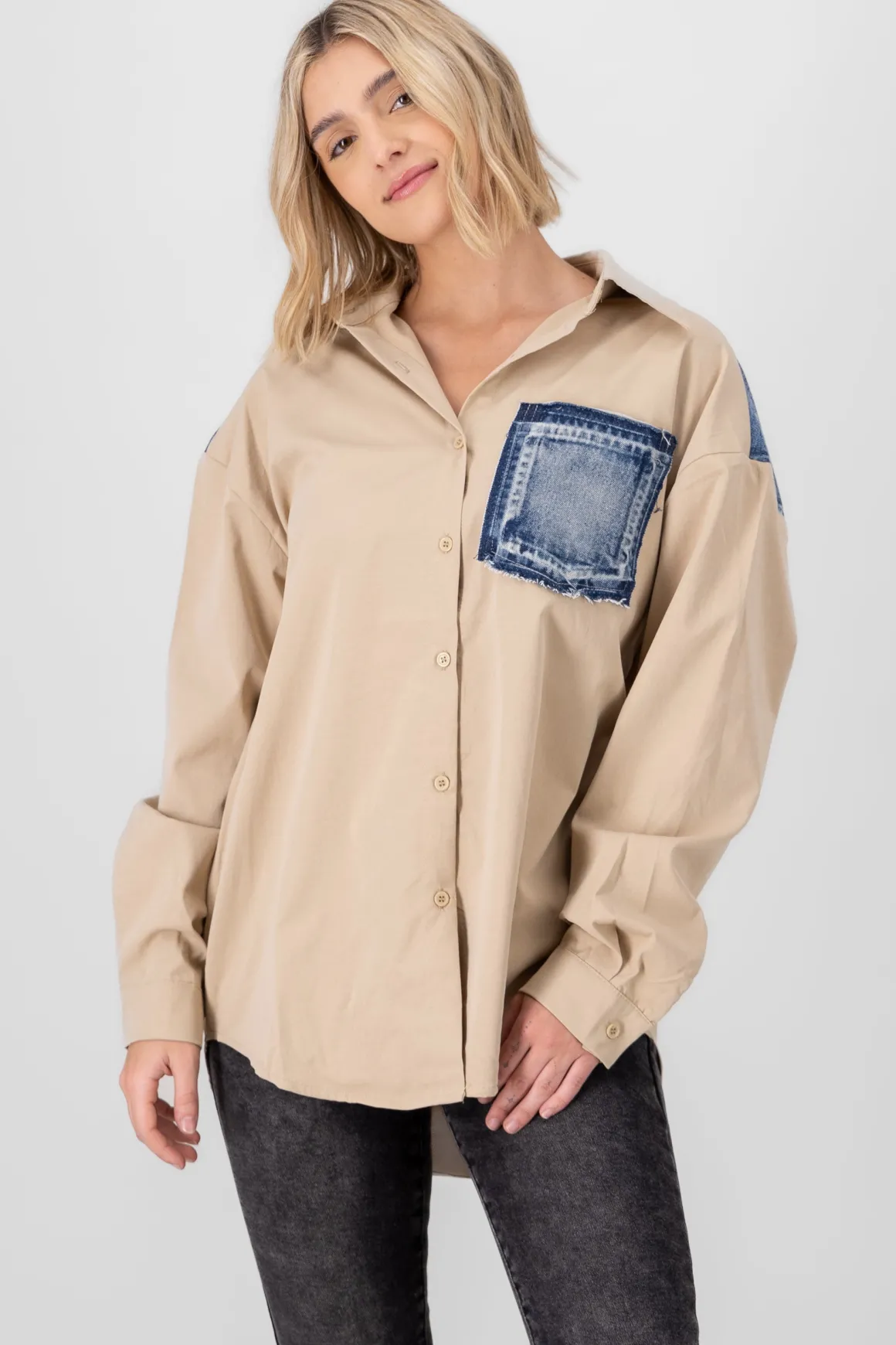 Dale un giro a tu look con esta camisa oversize, que combina detalles de contraste en la espalda de denim con un bolsillo en el pecho. Perfecta para un estilo casual pero con un toque único.