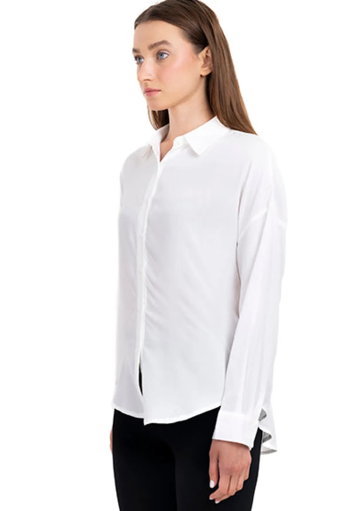 Camisa lisa de manga larga con solapa en cuello y cierre mediante botones frontales combinados a tono.