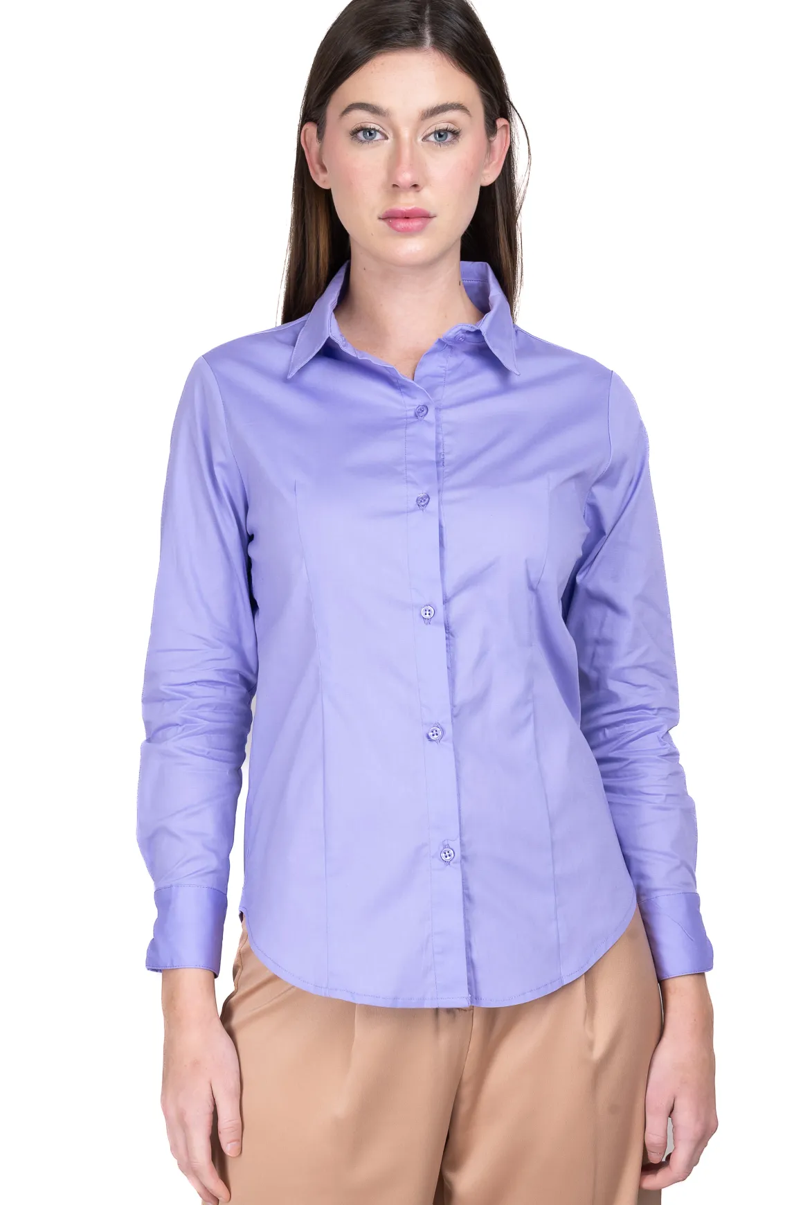 Camisa de cuello solapa con manga larga acabada en puño. Pinzas frontales y en espalda. Cierre frontal con botones