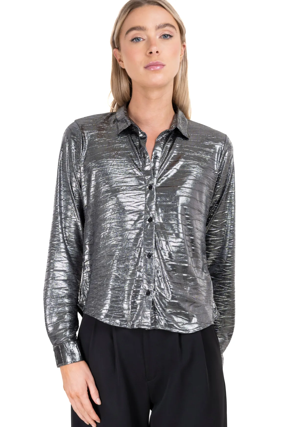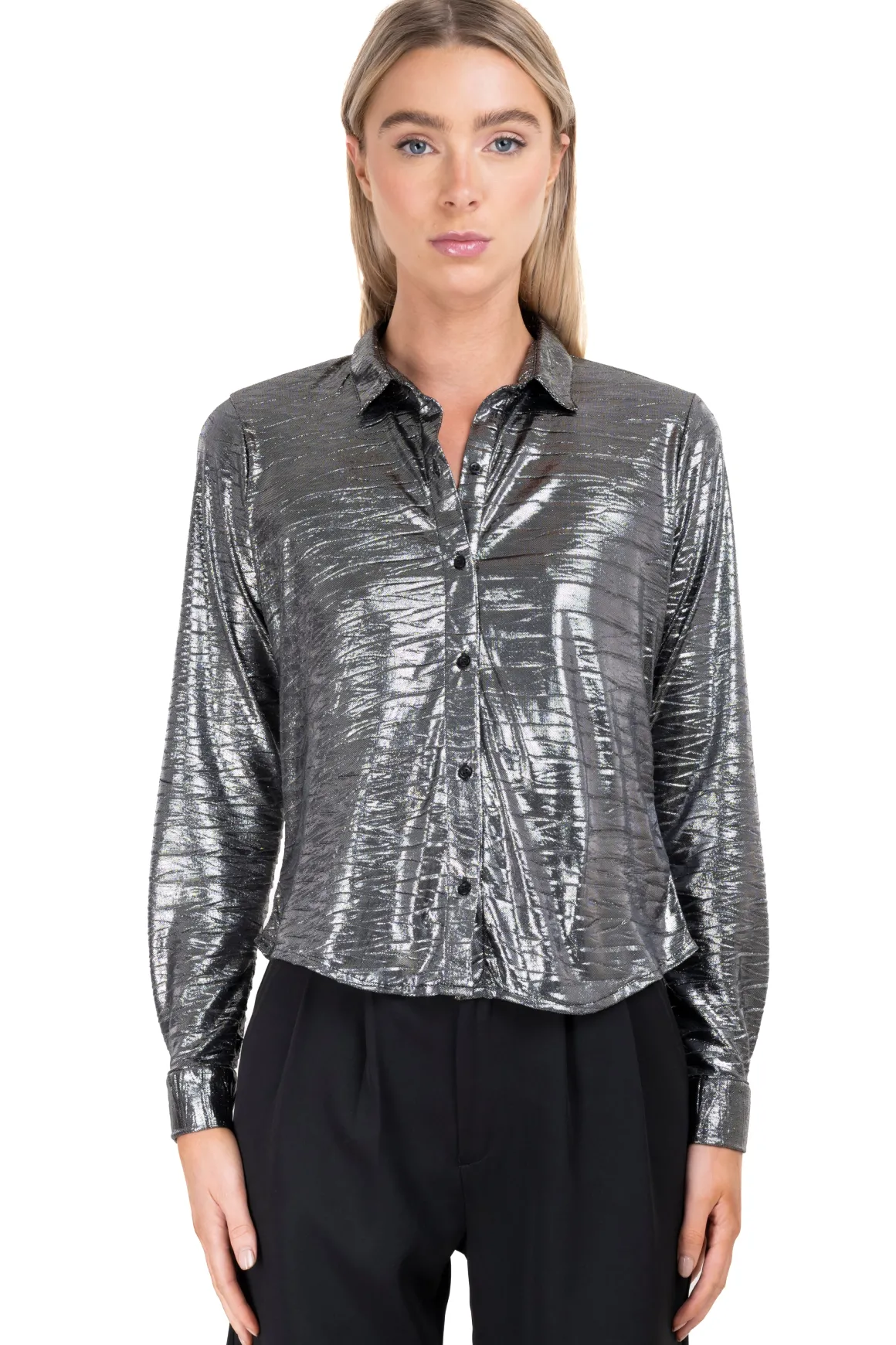 Camisa de cuello solapa y manga larga. Metálica con textura de zig zag.