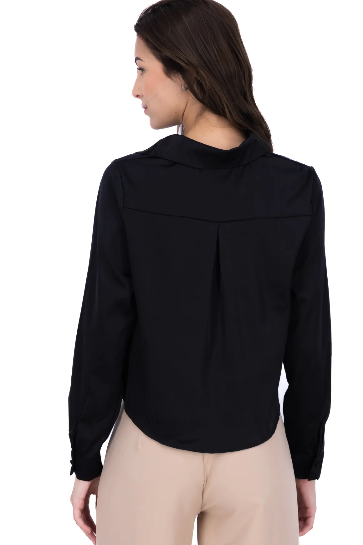 Camisa monocolor satinada con solapa en cuello, cierre mediante botones frontales y en puños.
