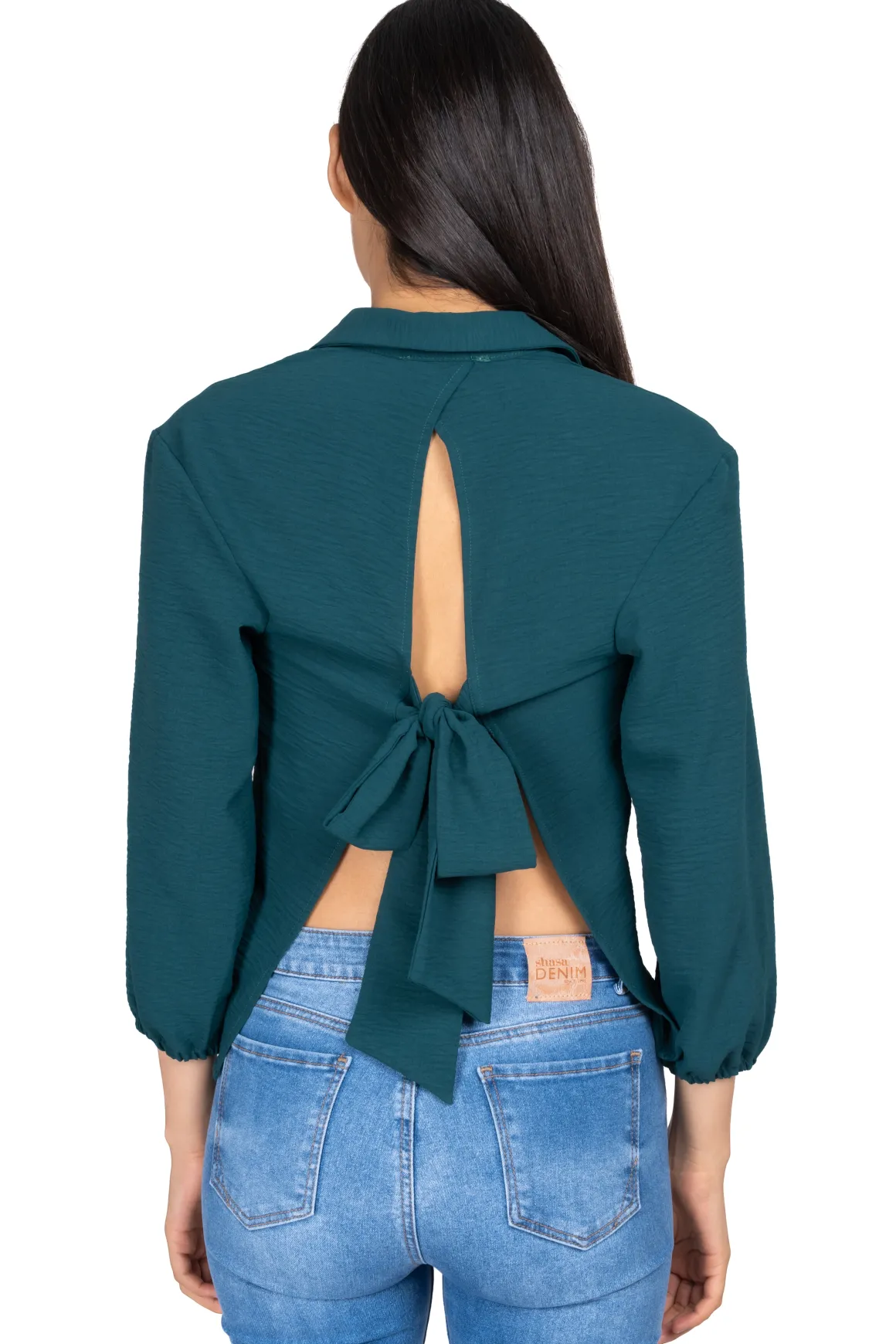 Camisa monocolor texturizada de manga larga con solapa en cuello y cierre delantero mediante botones combinados a tono.
