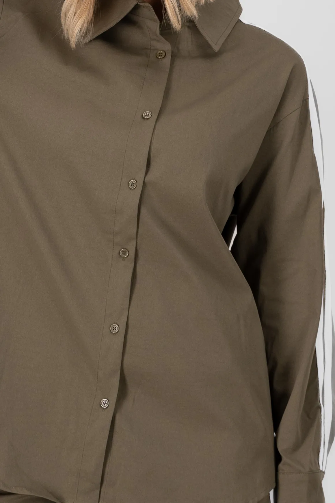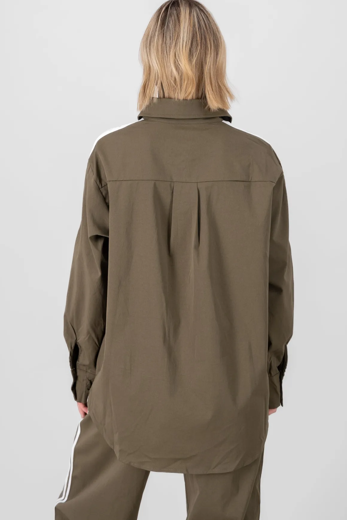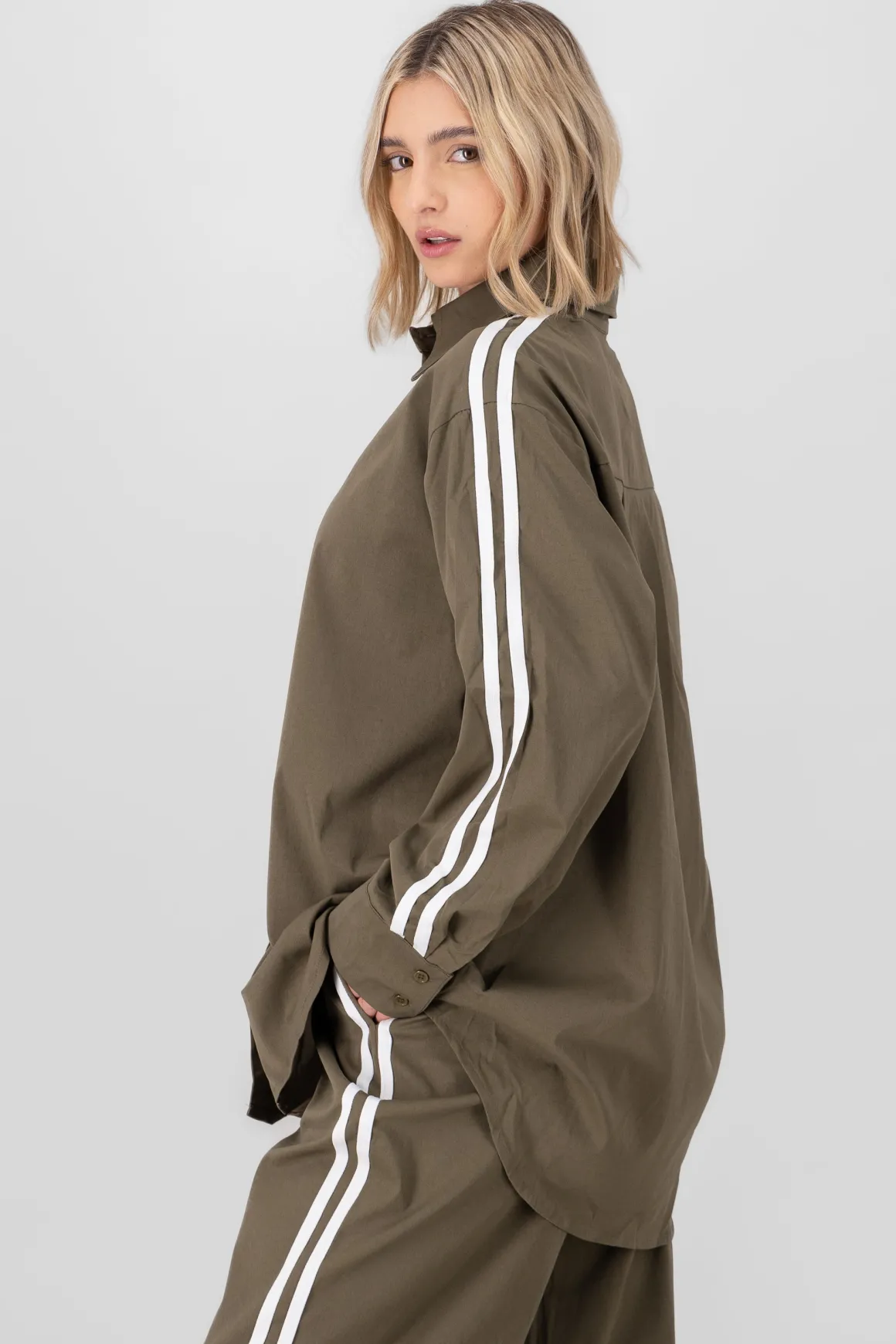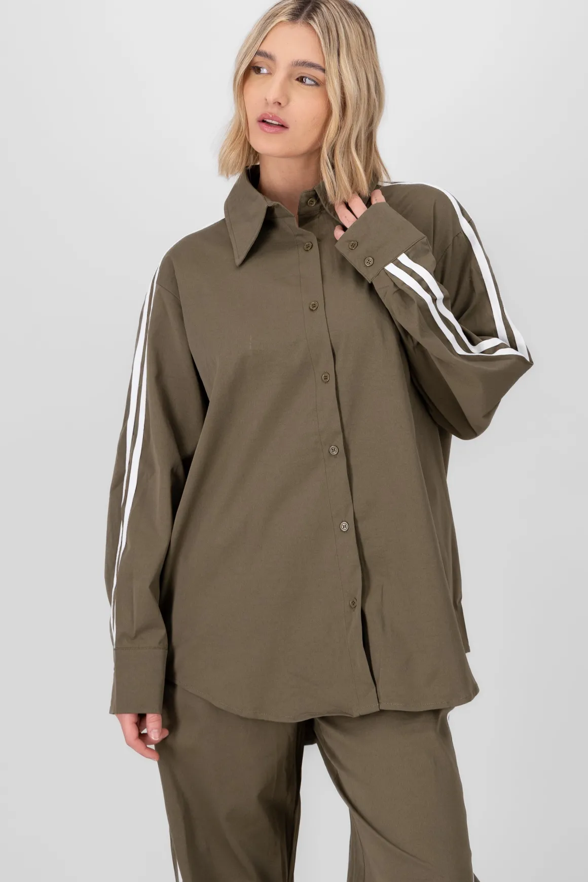 Dale un toque deportivo a tu estilo con esta camisa oversize. Los detalles de rayas dobles en las mangas y la solapa en el cuello la hacen perfecta para un look relajado y moderno.