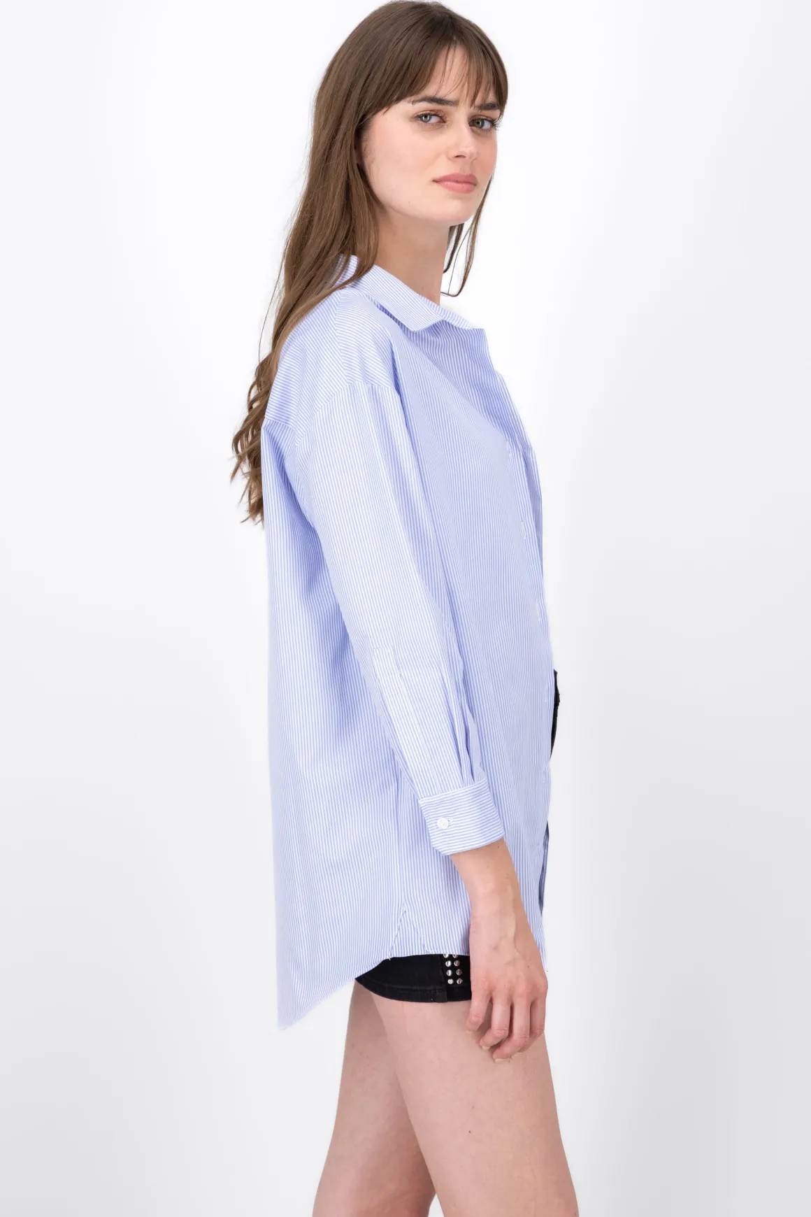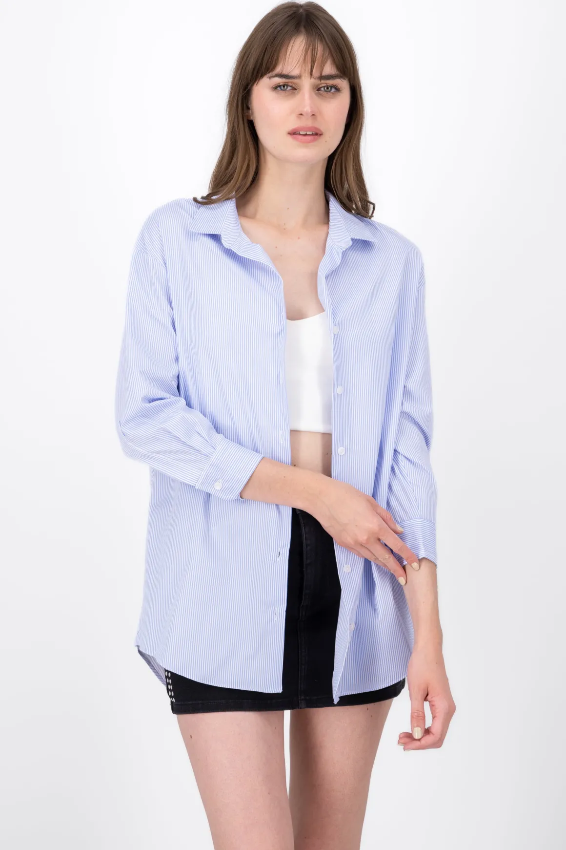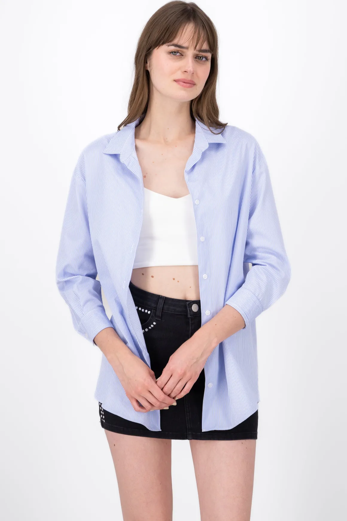 Descubre la elegancia y comodidad de nuestra camisa oversize de rayas bicolor. Con un cuello regular y mangas largas con botón, esta camisa es perfecta para cualquier ocasión. El cierre frontal con botones le da un toque moderno y funcional.