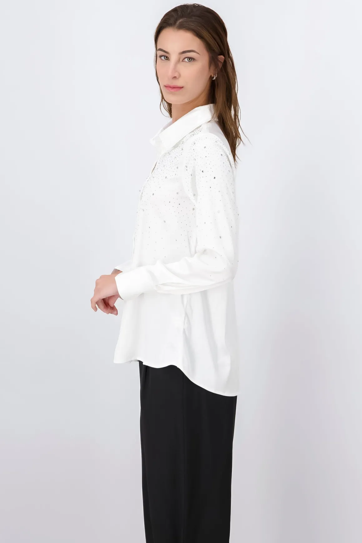Camisa satinada con cuello solapa y aplicación de multi brillos. Cierre frontal mediante botones combinados a tono.