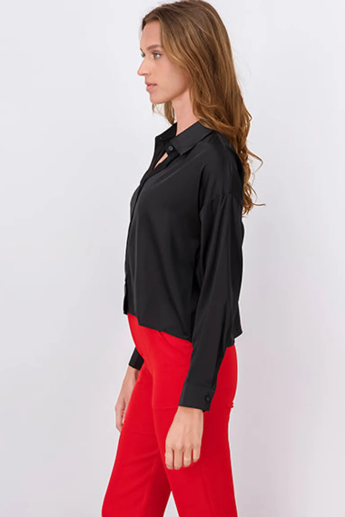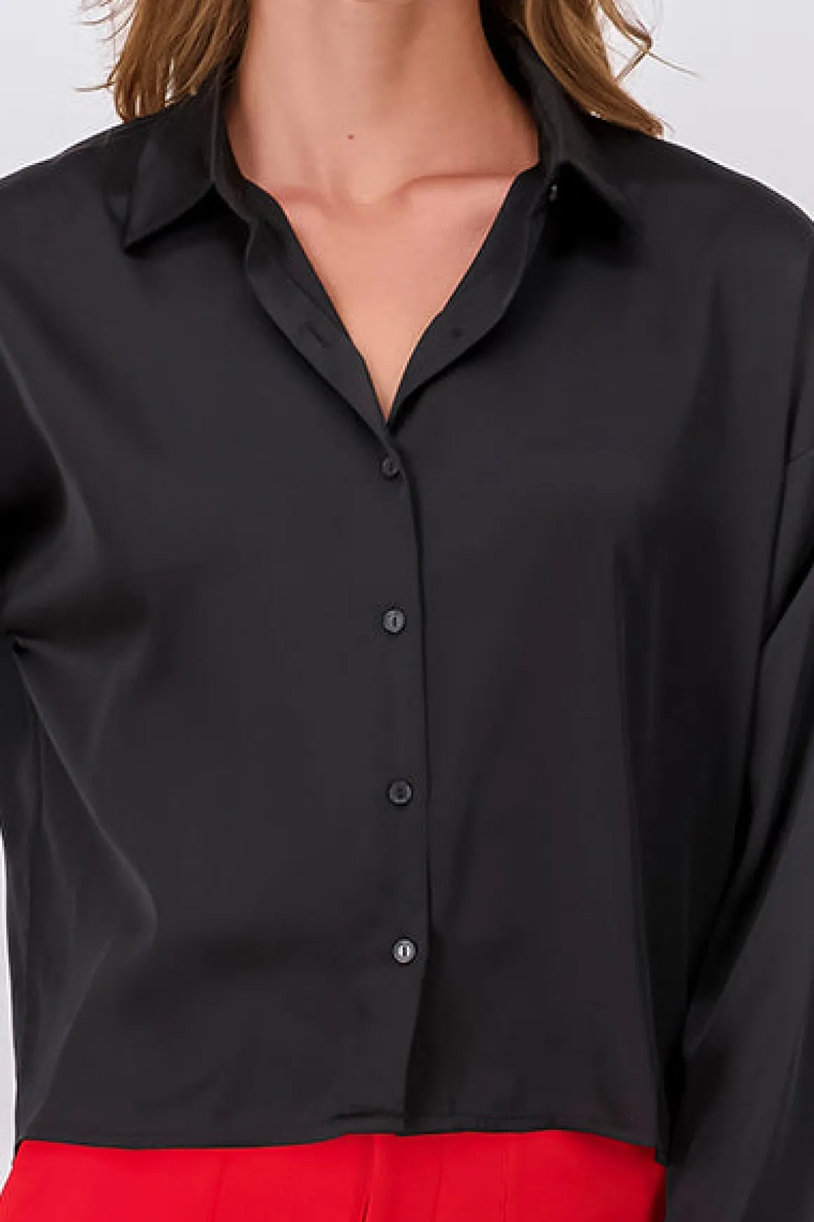 Camisa lisa de satín con cuello solapa y manga larga. Botones frontales, perfecta para combinar en cualquier ocasión.