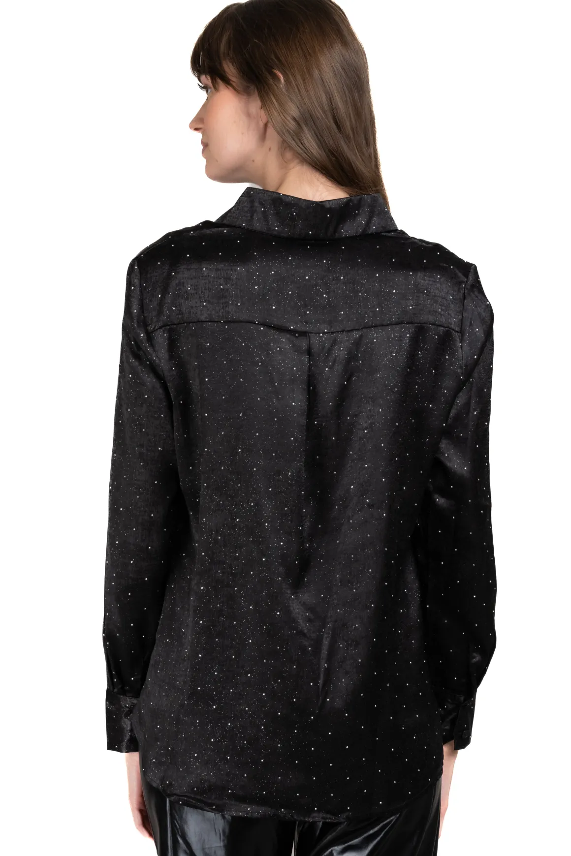 Camisa con efecto satinado y detalles de brillos. Cuello regular y manga larga con botones en puño. Cierre frontal con botones. Composición: 100% poliéster.
