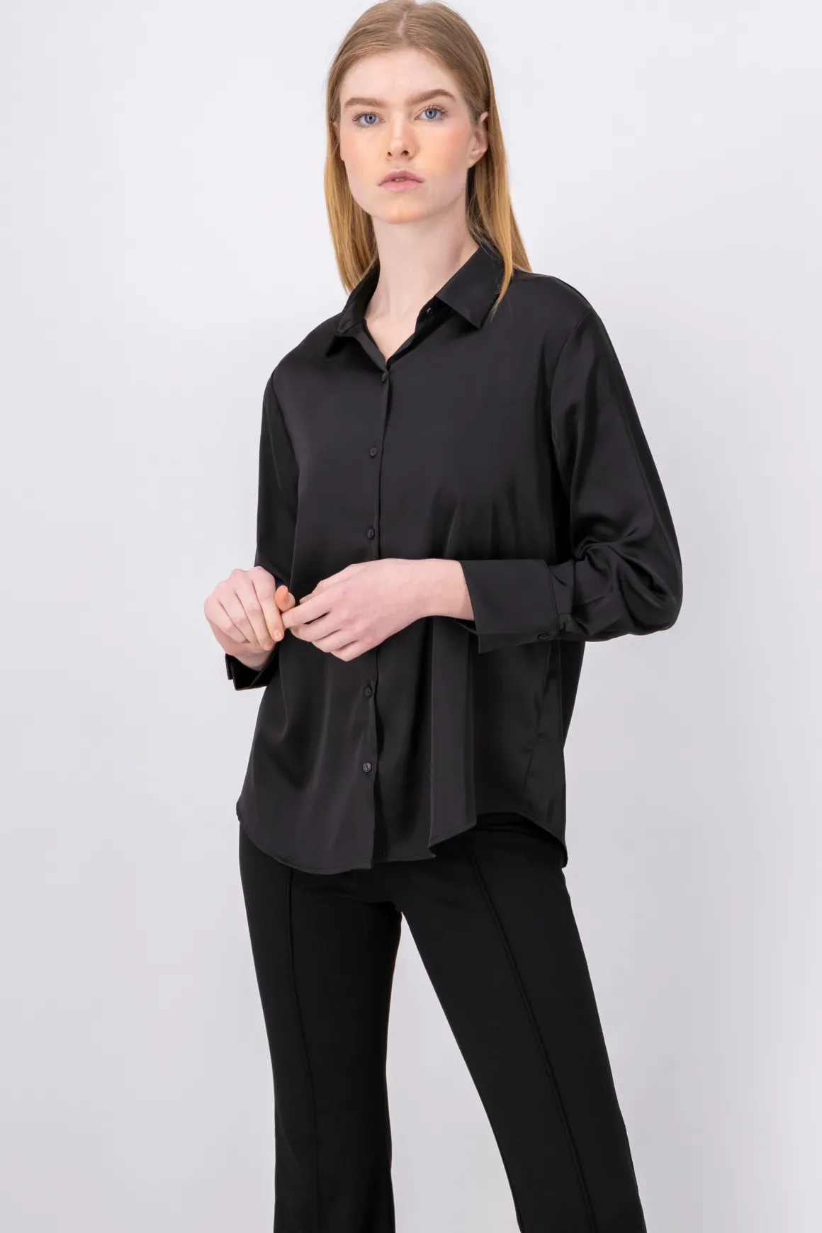 Camisa con efecto satinado de manga larga y cuello regular. Cierre delantero mediante botones.