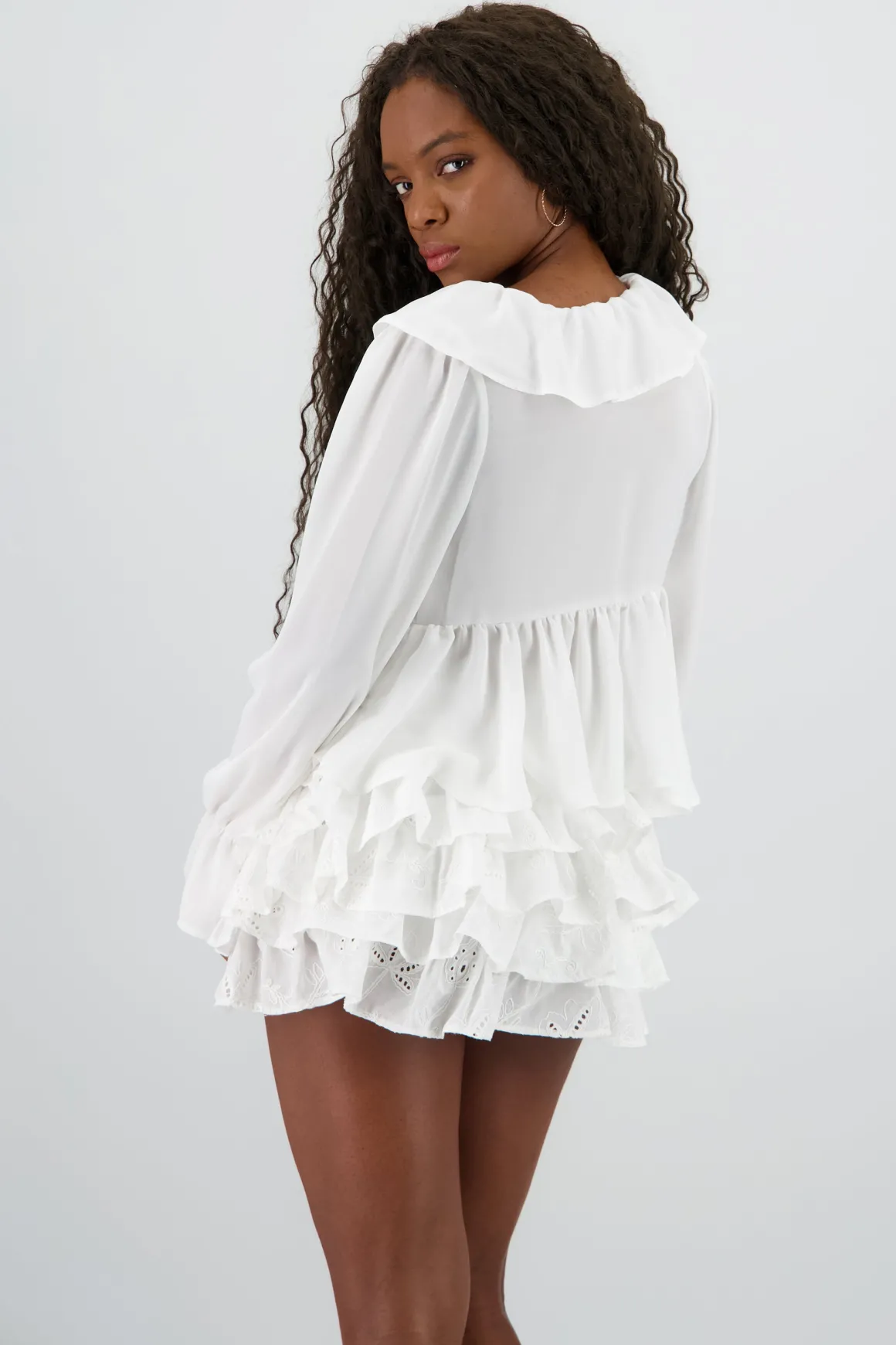 Camisa fluida con volantes, mangas largas, cordones ajustables y cuello redondo.