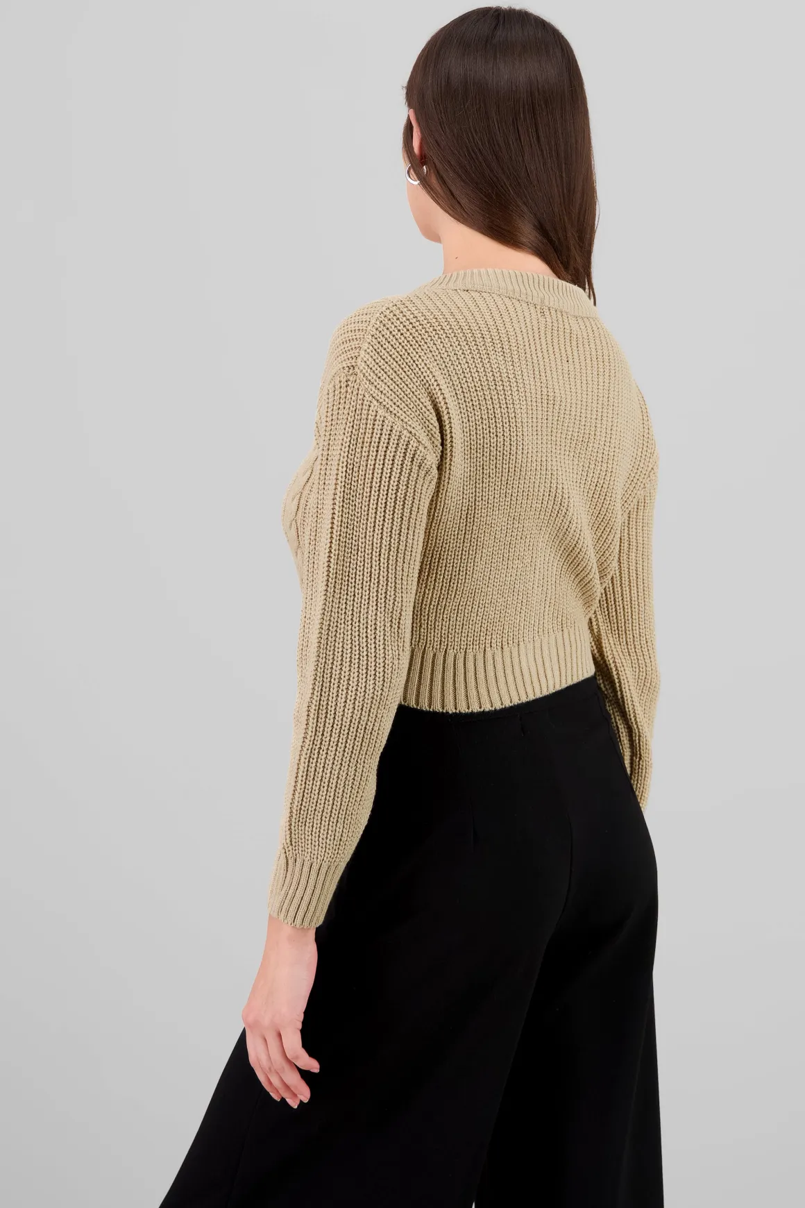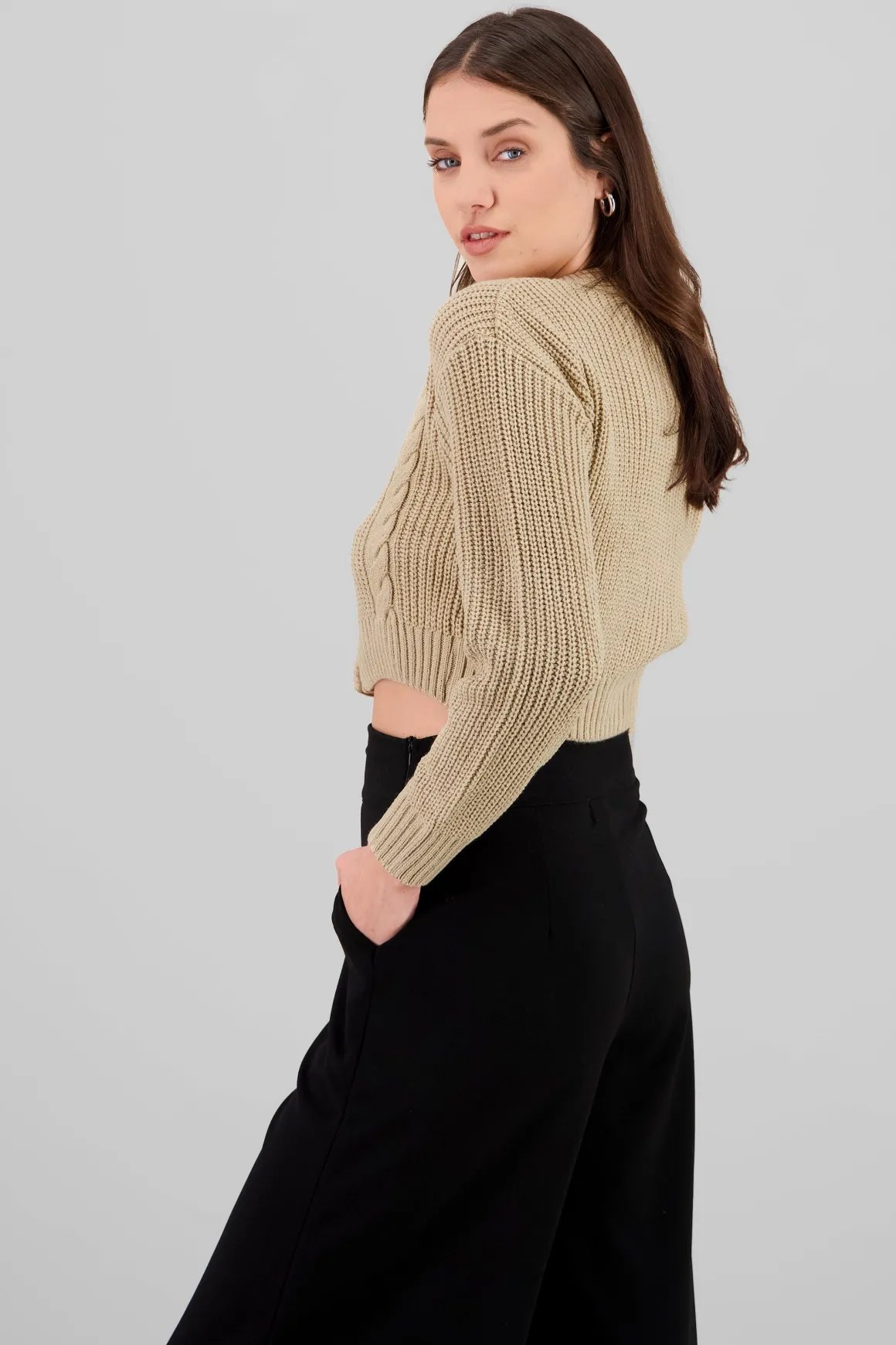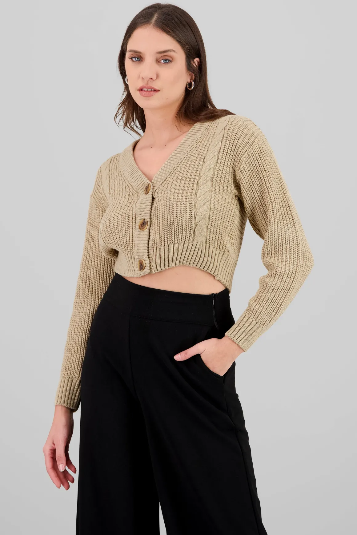 ¡Luce cálida y estilosa con este cárdigan tejido! El punto trenza a los lados le añade un detalle especial.