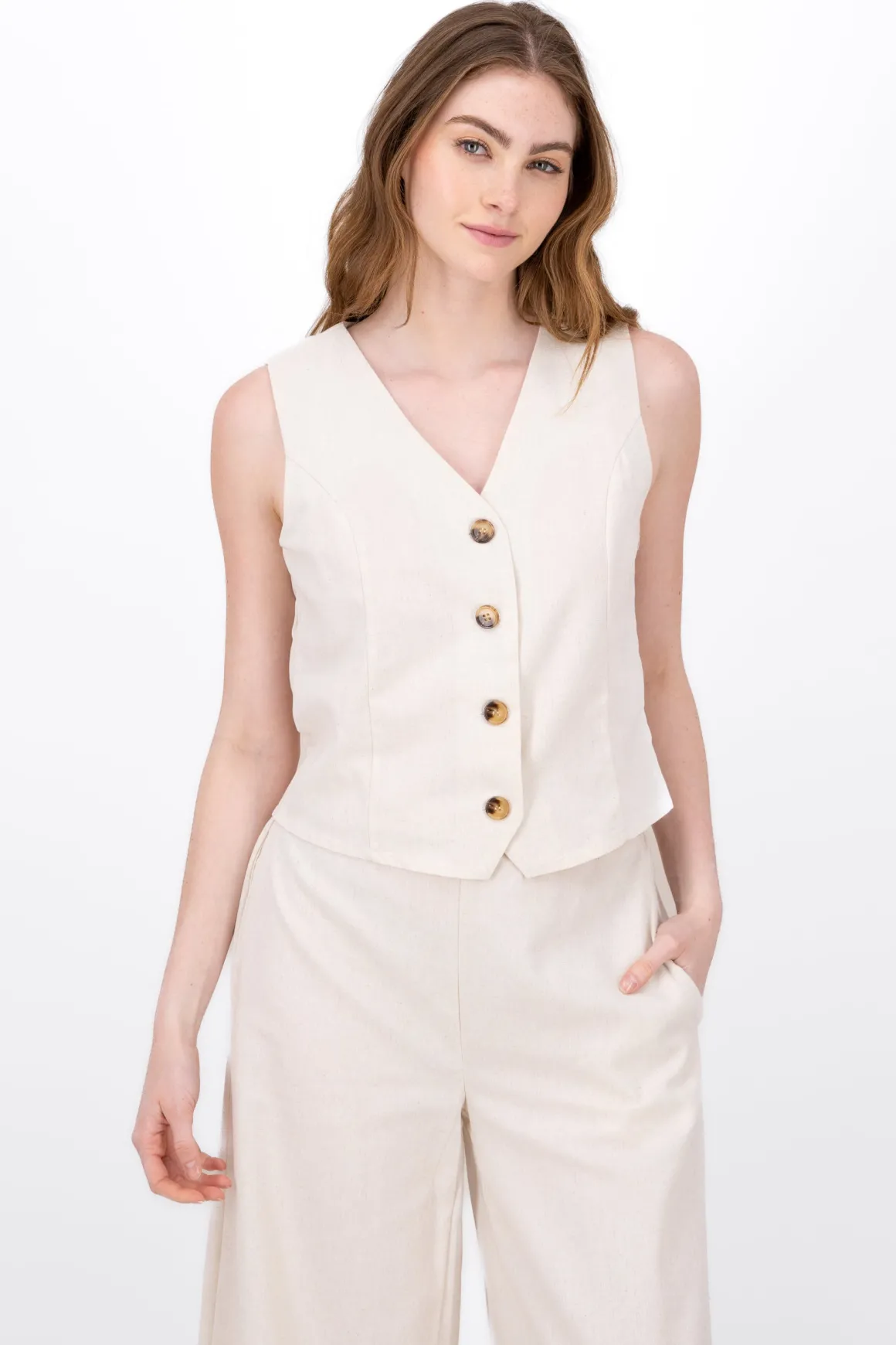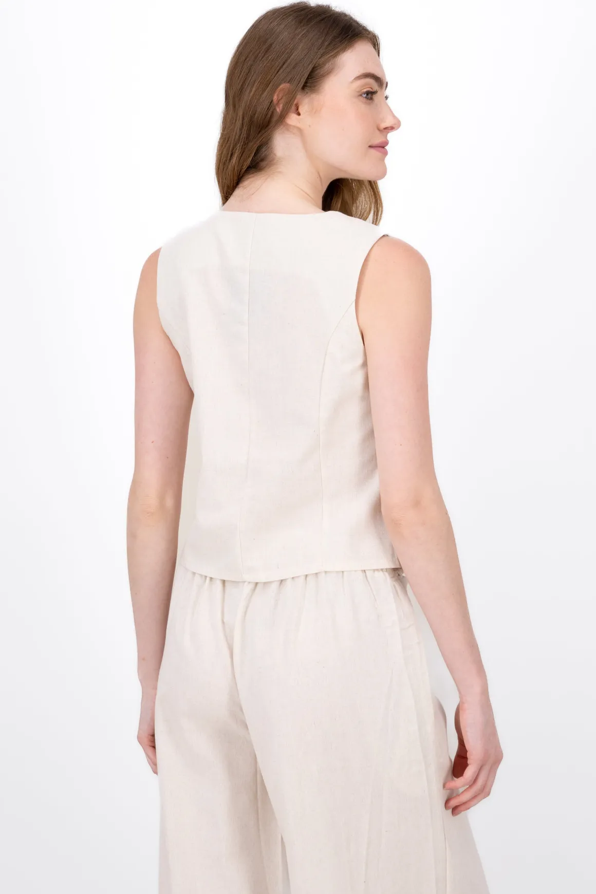Chaleco sastre de lino con botones, elegante y ligero. Diseño moderno, ajuste perfecto.