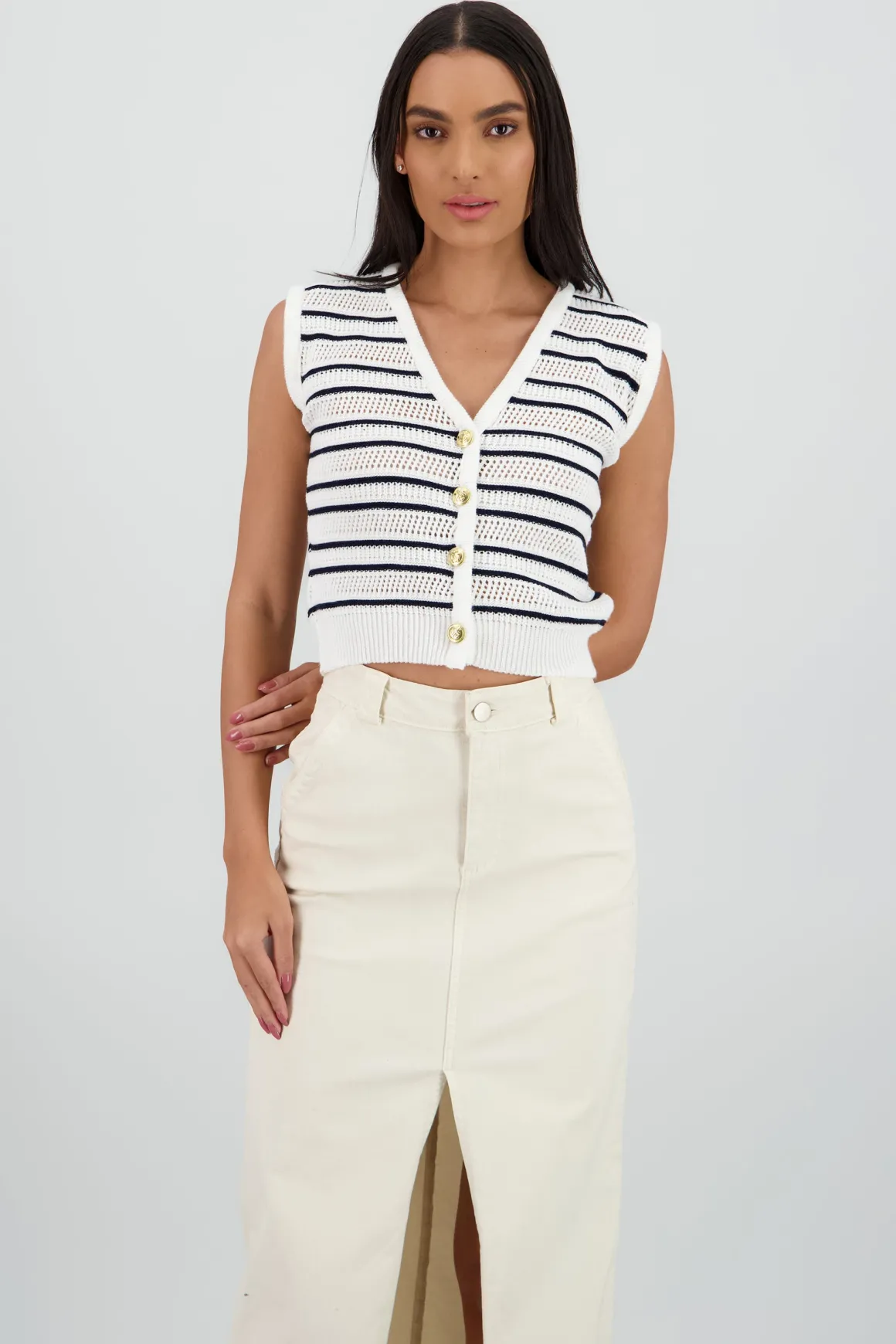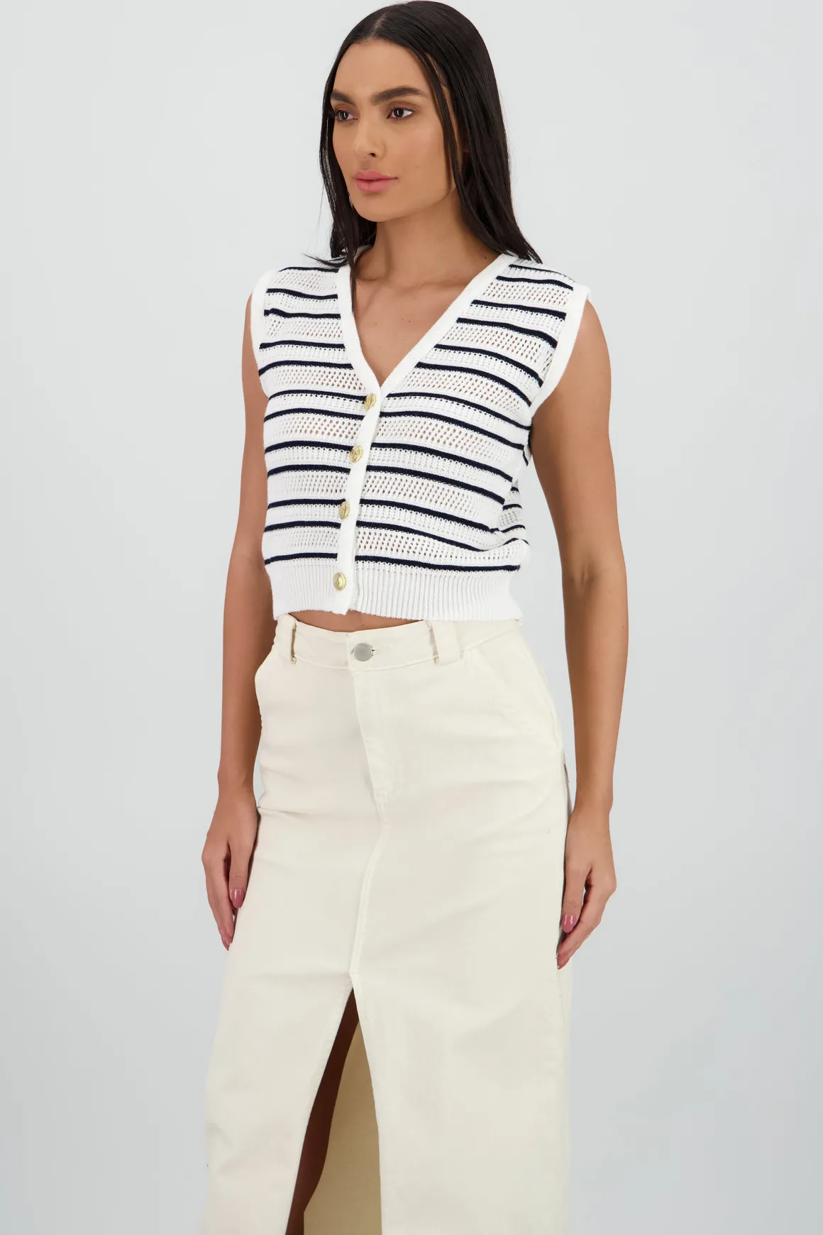 Chaleco tejido de punto con diseño de rayas, corte ceñido y versátil.