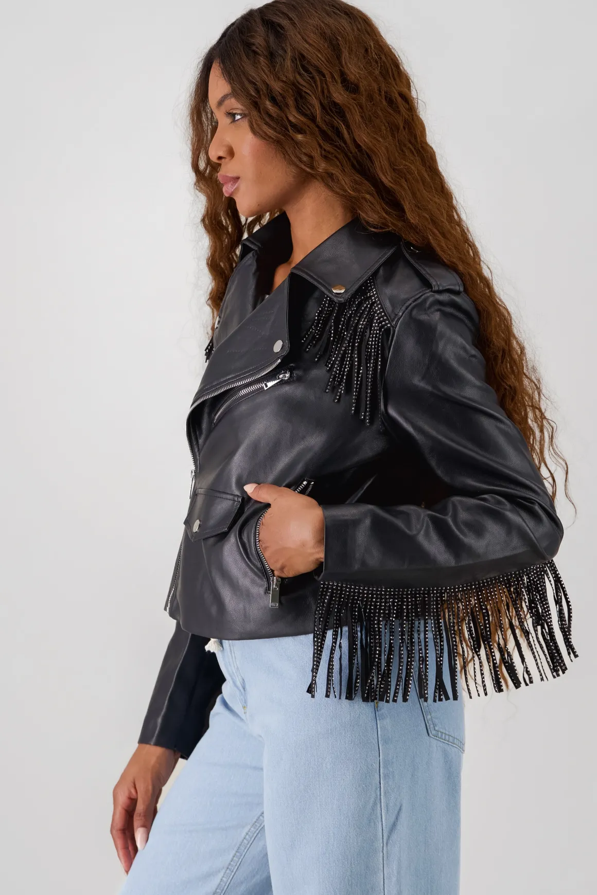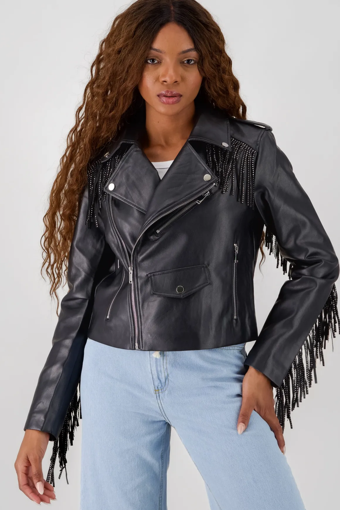 Desata tu lado más audaz con esta chamarra biker de efecto piel, diseñada para destacar a donde vayas. Su cierre cruzado le da un aire rebelde, mientras que los flecos con brillos añaden un toque de movimiento y brillo que no pasará desapercibido. Esta biker es perfecta para quienes buscan añadir personalidad y actitud a su look, haciéndola la pieza ideal para tus noches más atrevidas. ¡Atrévete a llevarla y conviértete en el centro de todas las miradas!