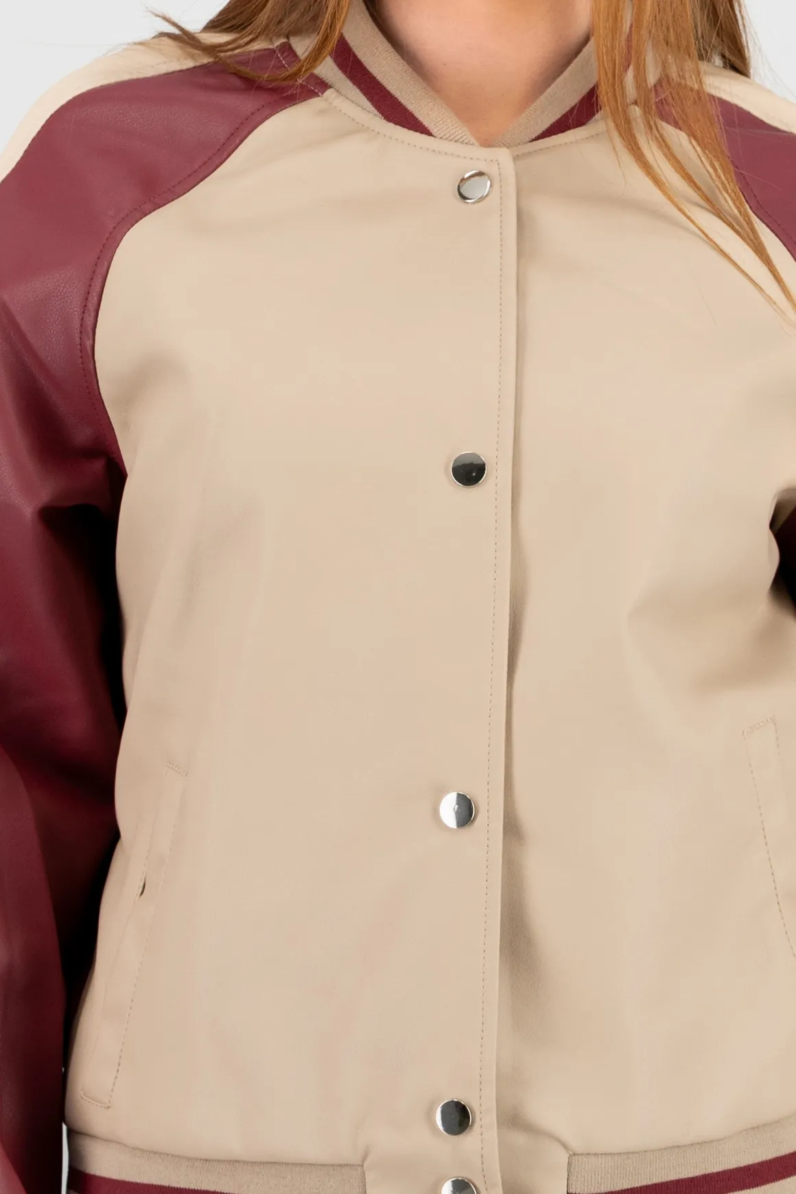 Chamarra bomber estilo varsity efecto piel: Esta chamarra bomber estilo varsity con efecto piel es perfecta para un look urbano y cool.