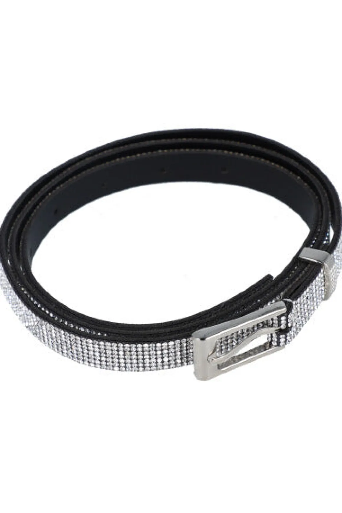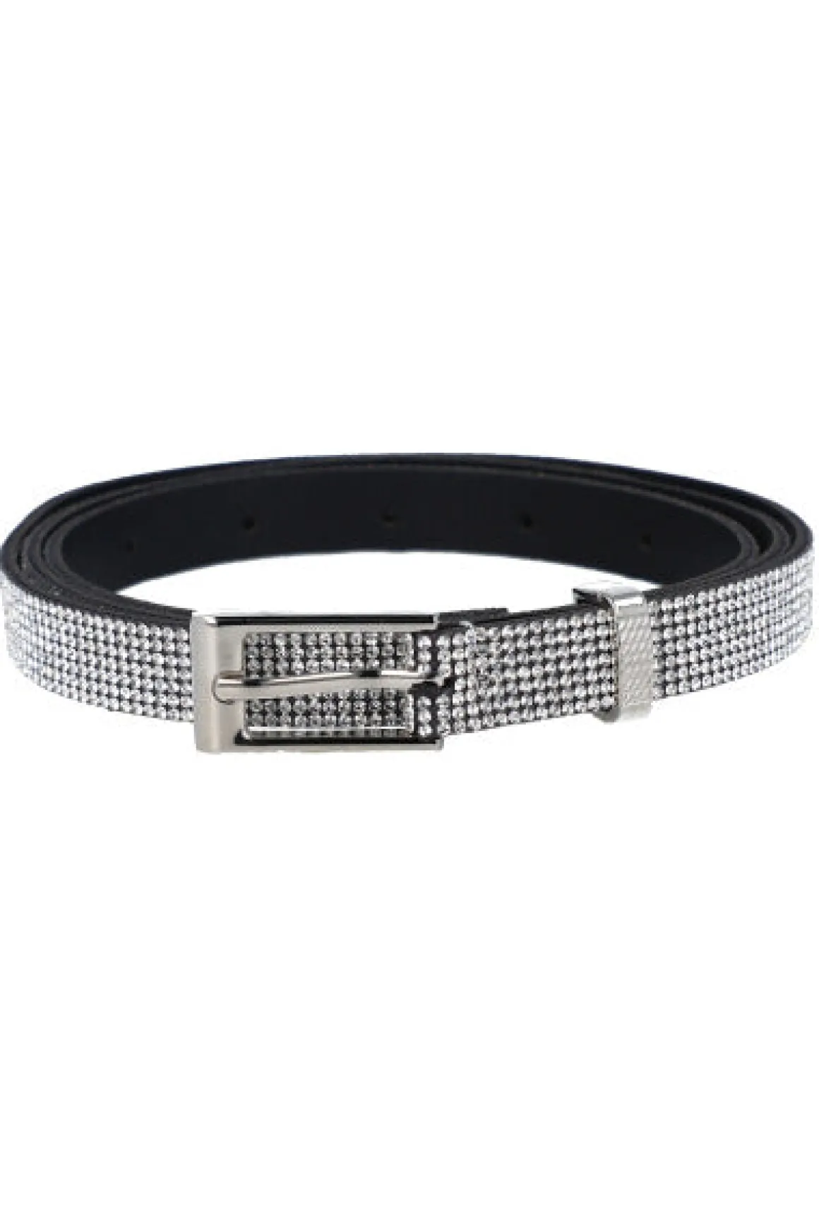 Cinturón en un solo tono con un acabado que simula la textura y apariencia de la piel con aplicaciones de brillos, ¡sin crueldad animal! Diseño con hebilla metálica rectangular. Con dimensiones ideales para un ajuste perfecto, este cinturón es la opción para resaltar tu cintura.