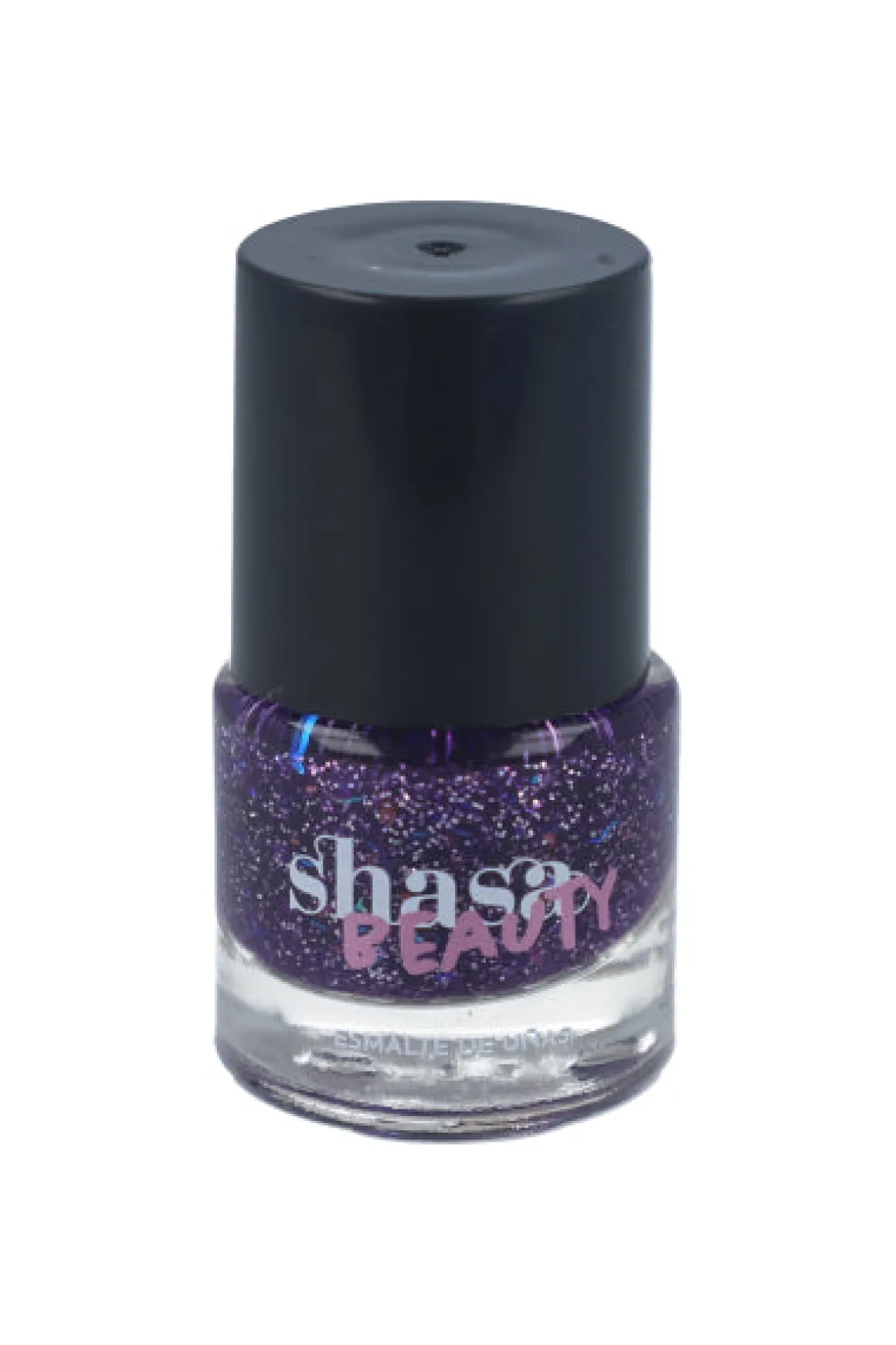 Esmalte morado con brillos. Contenido 10 ml. Aplicación con brocha.