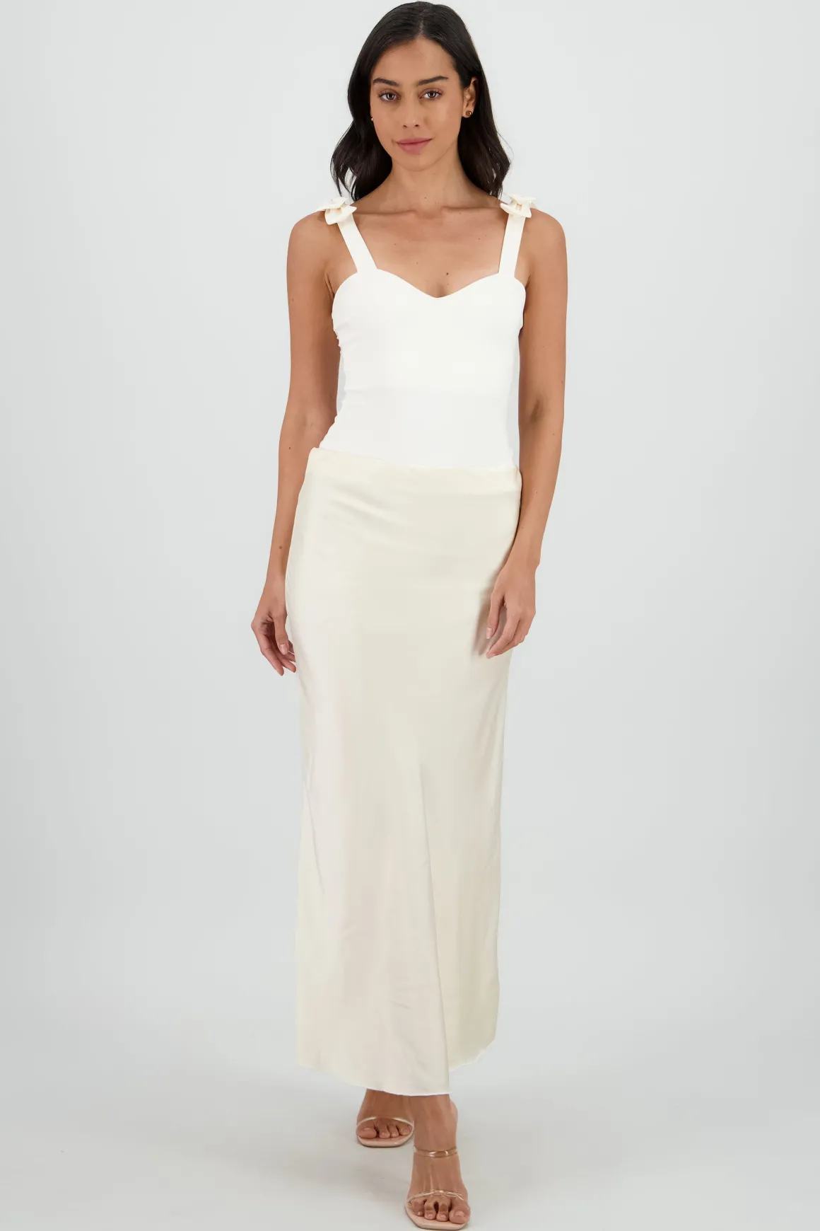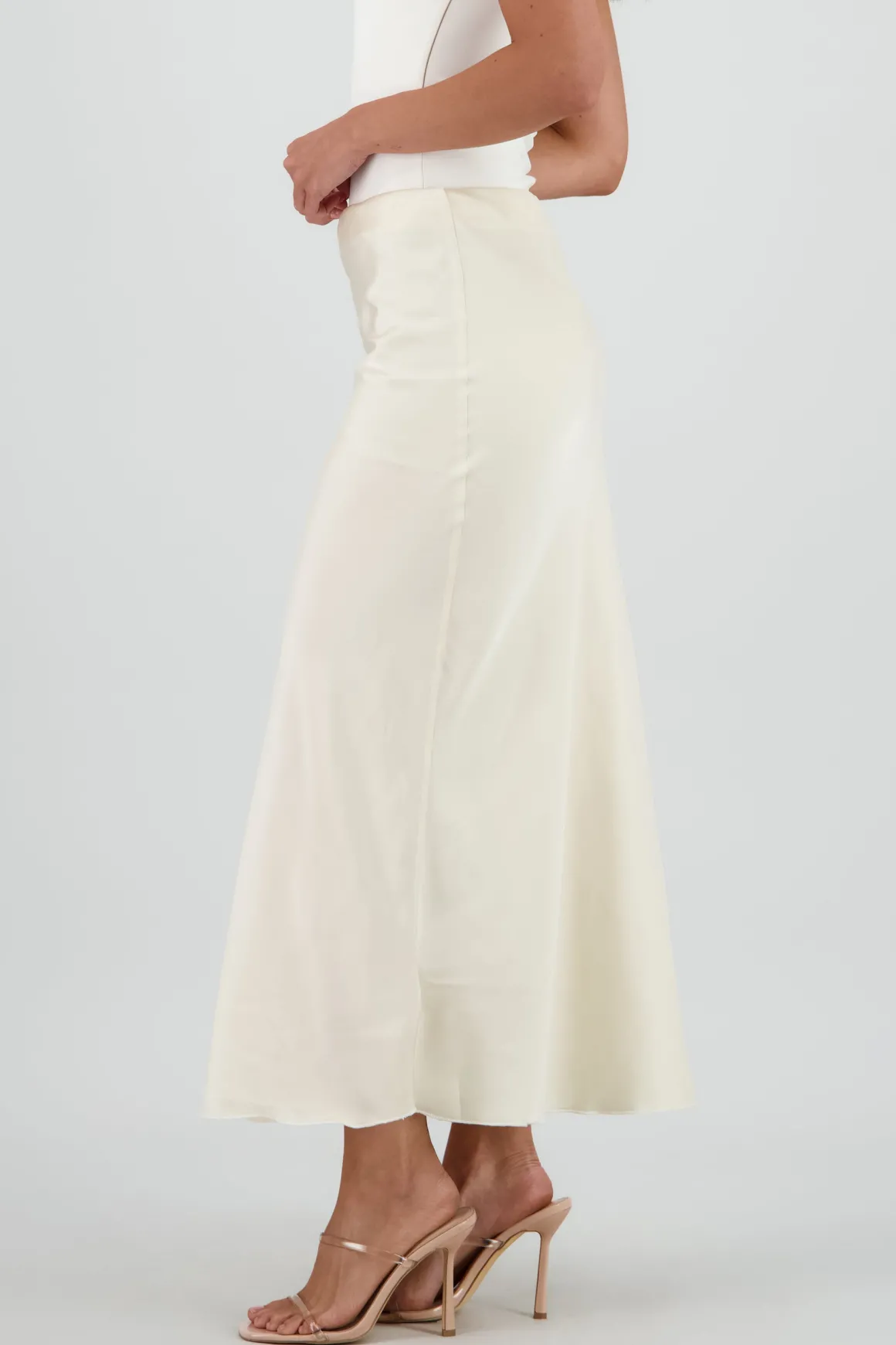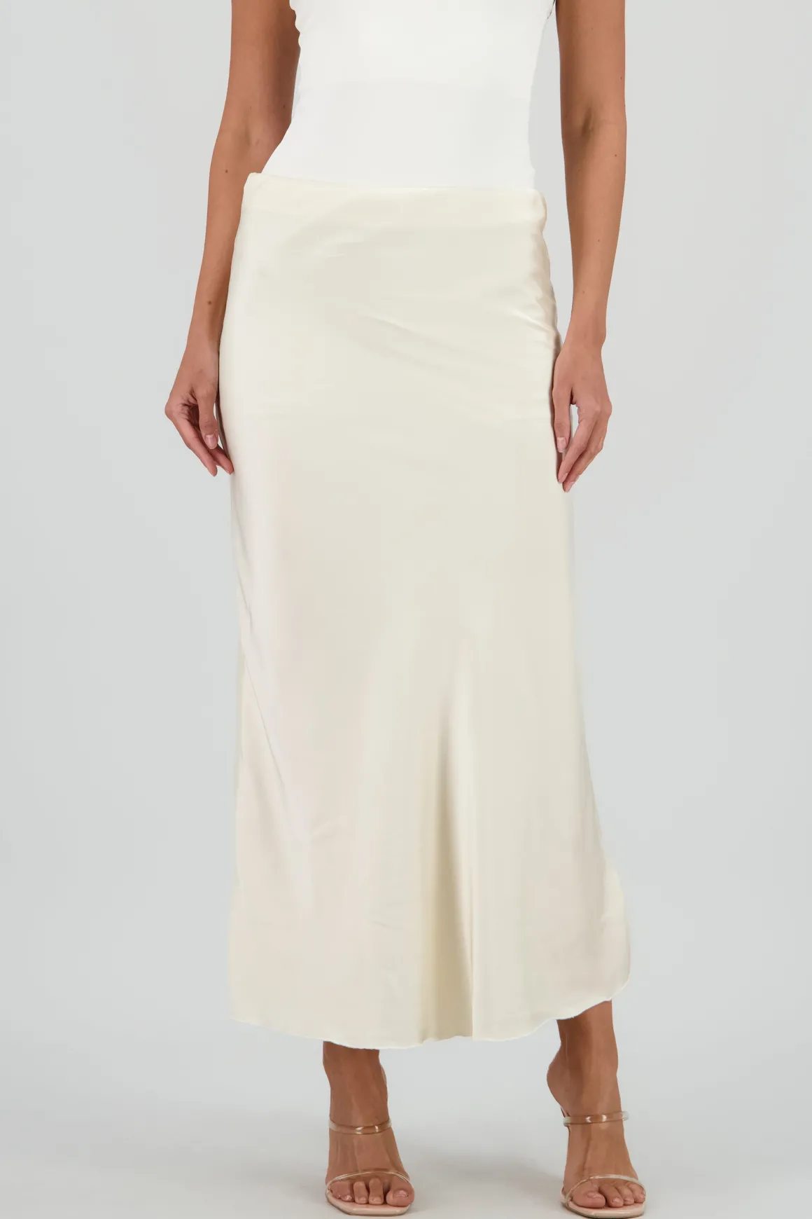 Falda de satin con cintura alta, corte fluido y midi.