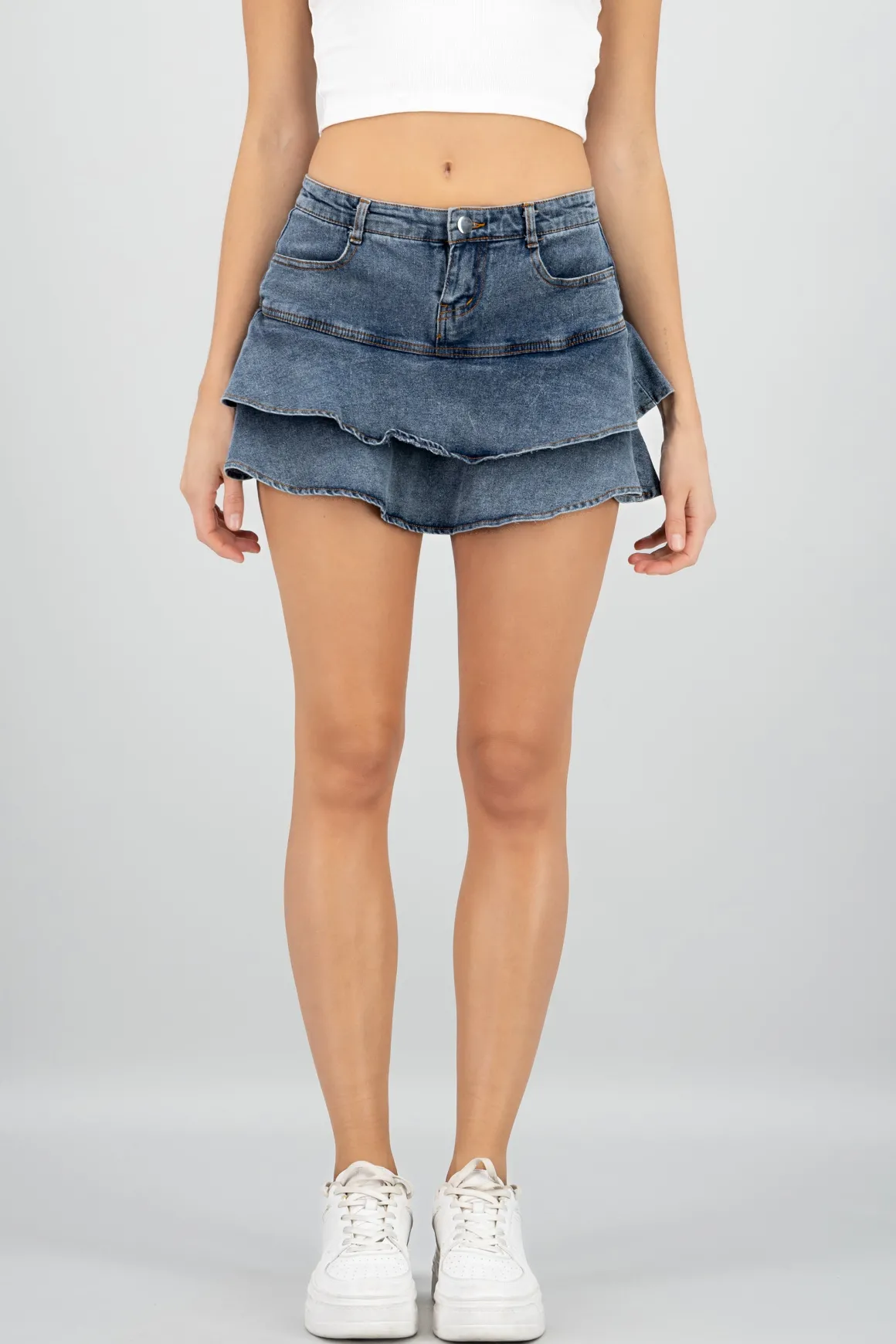 La falda short denim olanes es la prenda perfecta para lucir a la moda y con estilo en cualquier ocasión. Con un diseño de olanes que agrega un toque de feminidad y elegancia, esta falda corta es un imprescindible en tu armario.