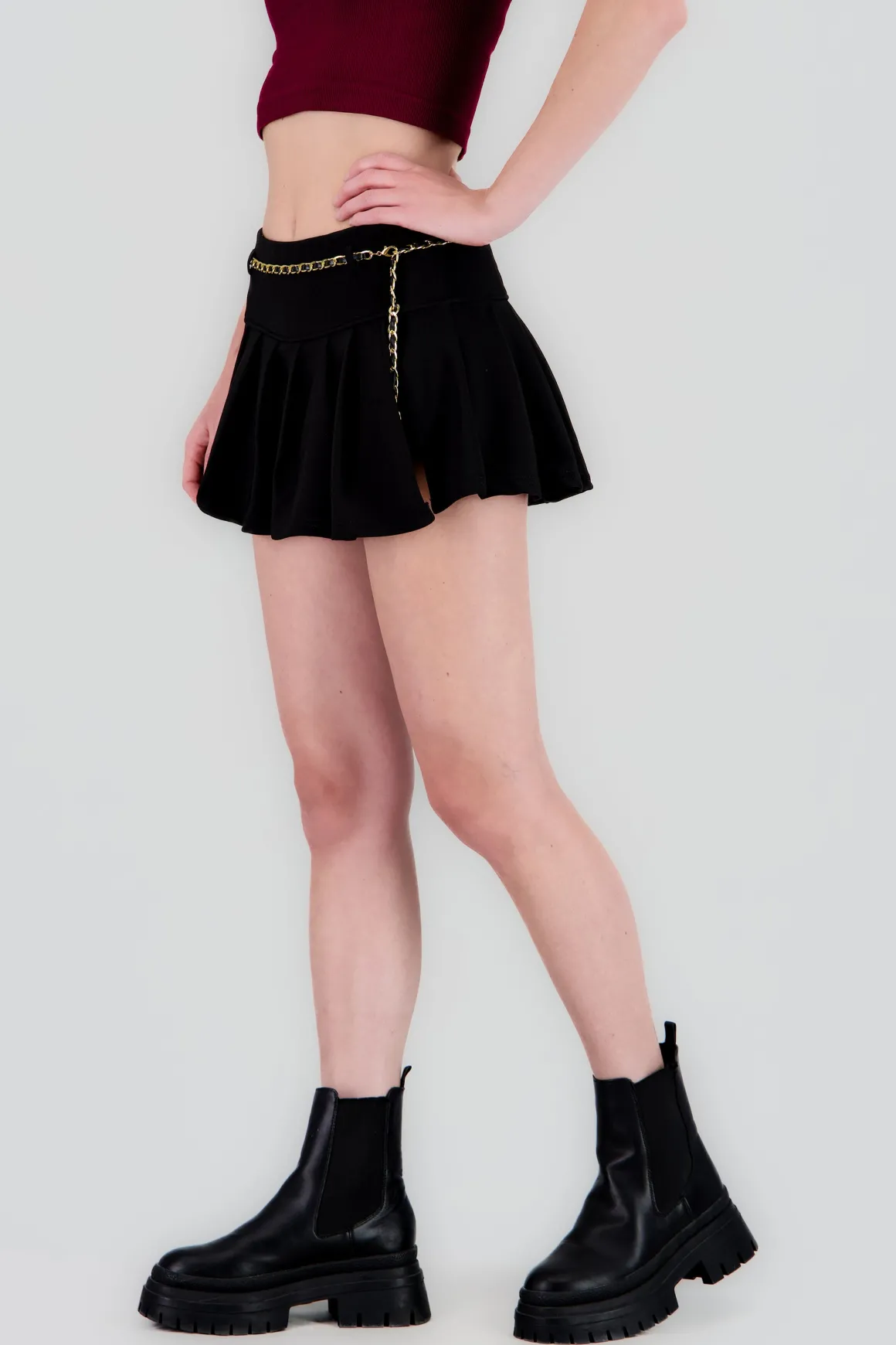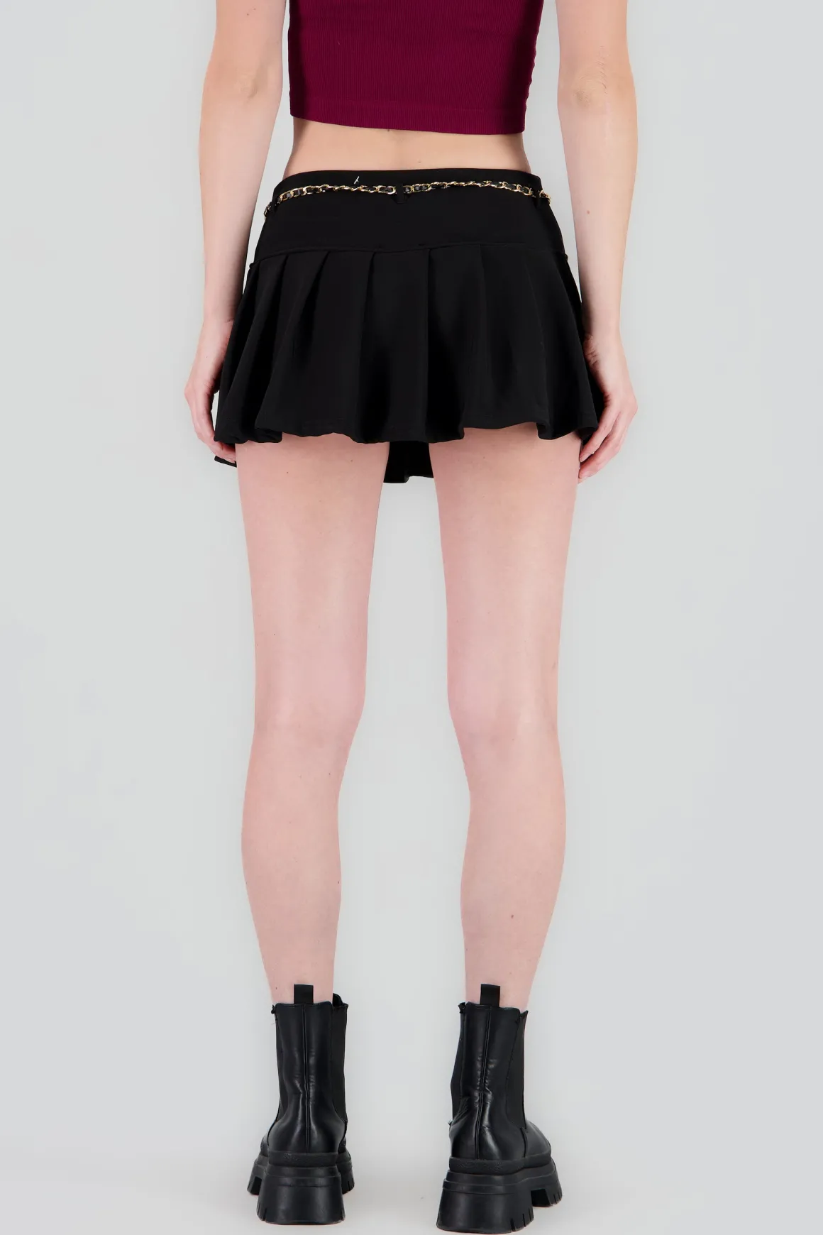 Esta falda tableada es la elección perfecta para quienes buscan un toque de originalidad y estilo. Con un detalle de cadena que añade un giro moderno, esta falda se convertirá en tu favorita para cualquier ocasión.