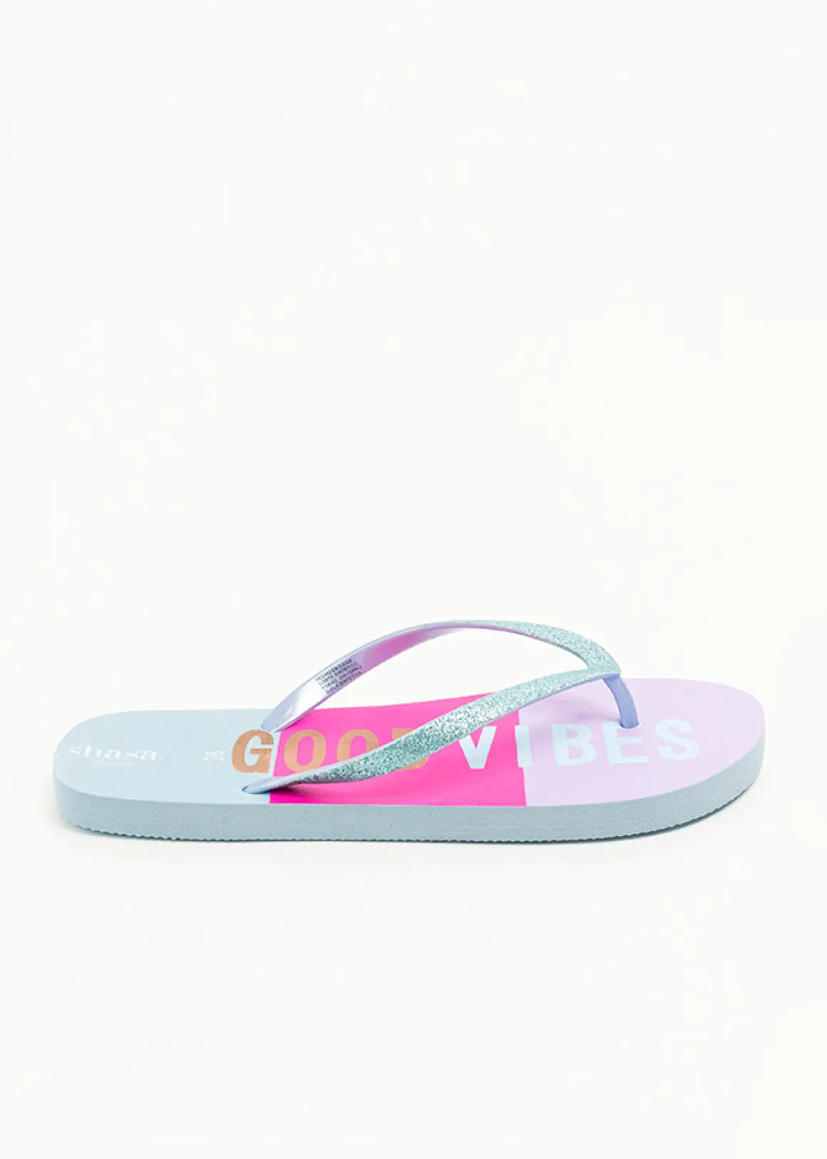 ¡Luce increíble con nuestras sandalias flip flop! Estas sandalias cuentan con una suela estampada con el texto «good vibes» y cintas delgadas con glitter que añaden un toque brillante a tu estilo. Ideales para la playa o la piscina, son perfectas para complementar tus outfits frescos y modernos.