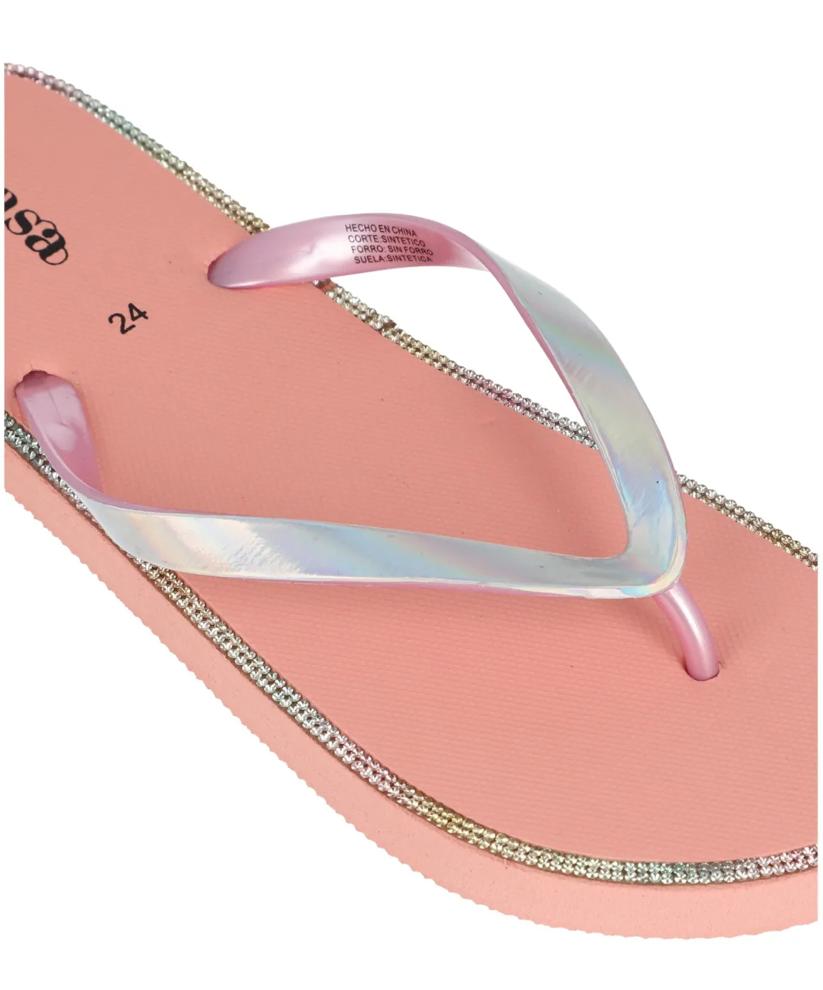 Los bordes de la suela con aplicación de brillos aportan un extra de destello, haciendo que cada paso brille. Ideales para la playa, la piscina o cualquier salida casua son el accesorio imprescindible para tus días soleados.