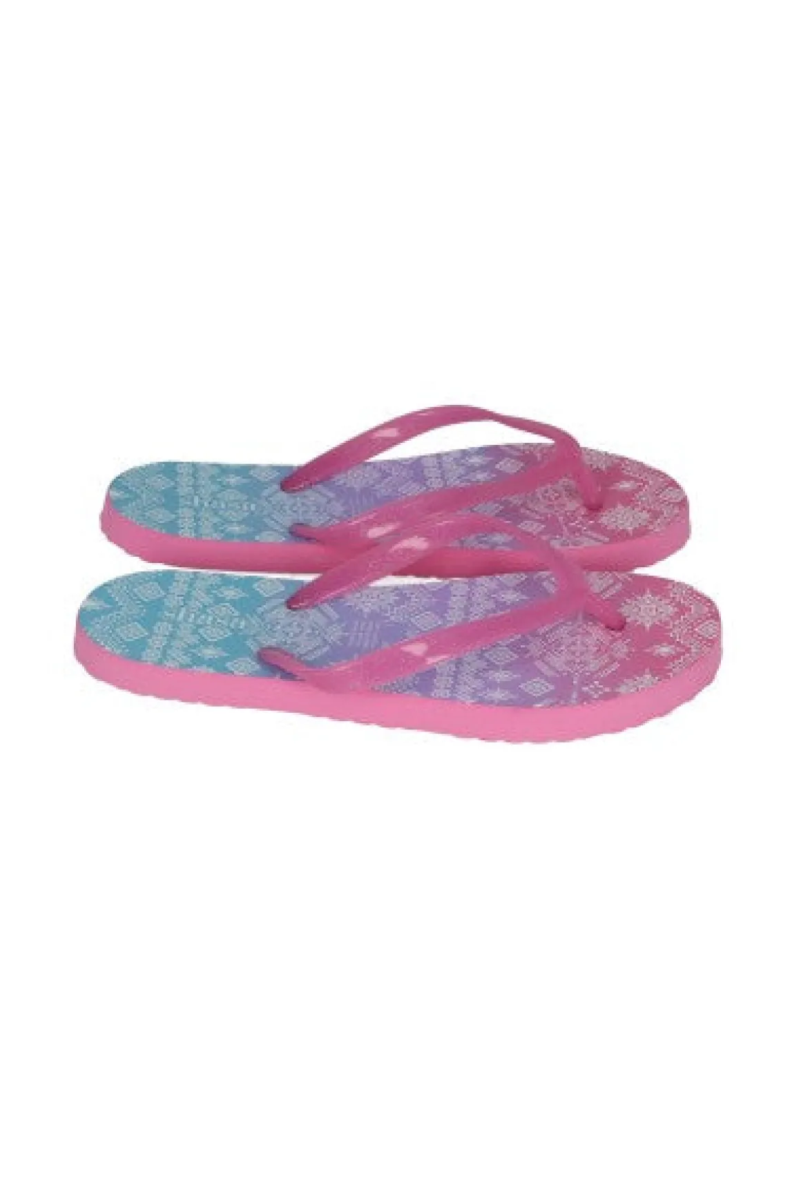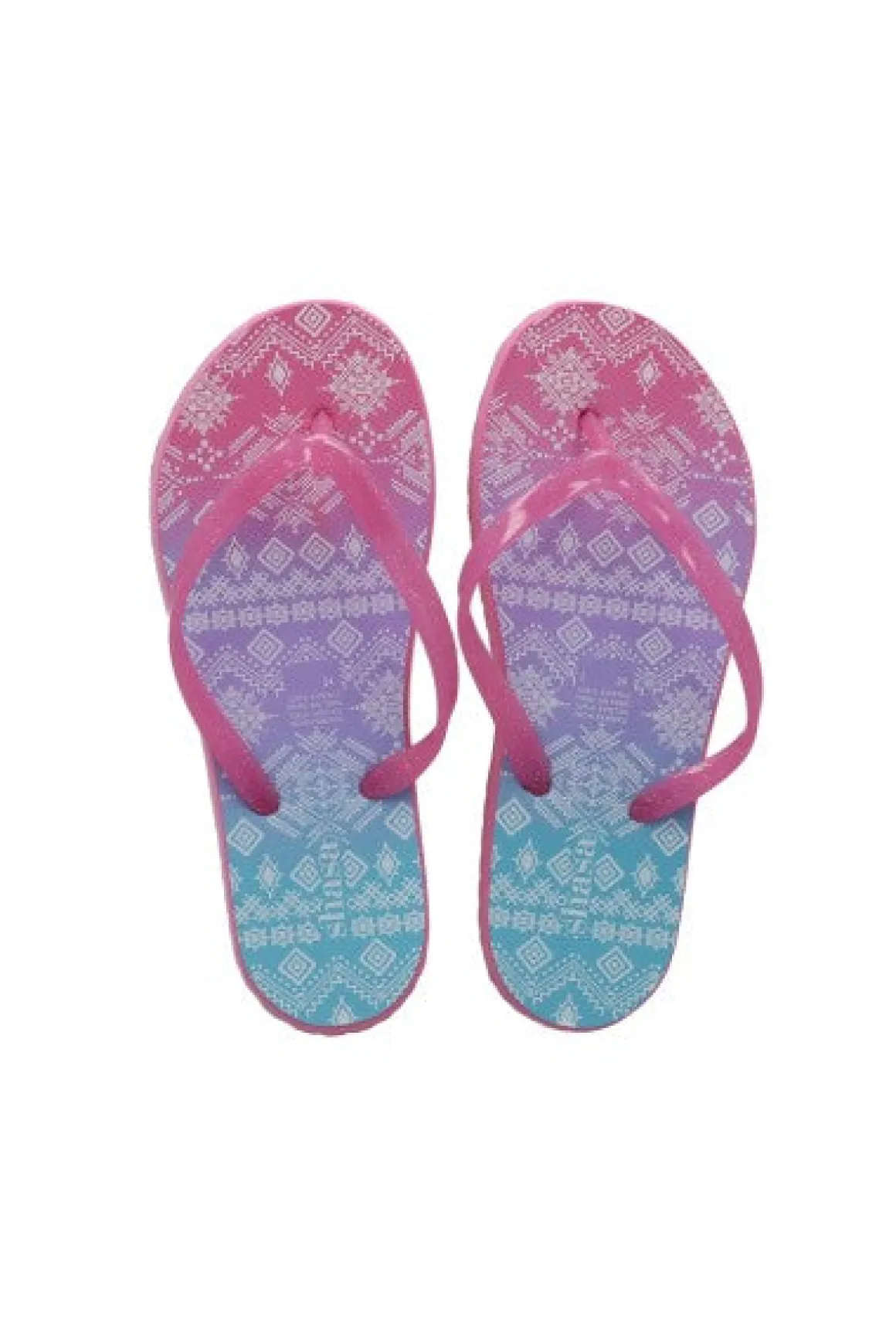 Flip flop suela de eva antiderrapante pata de gallo. Tiras en color sólido con brillos. Estampado tribal con efecto degradado.