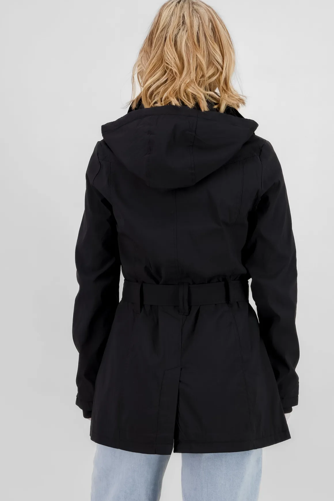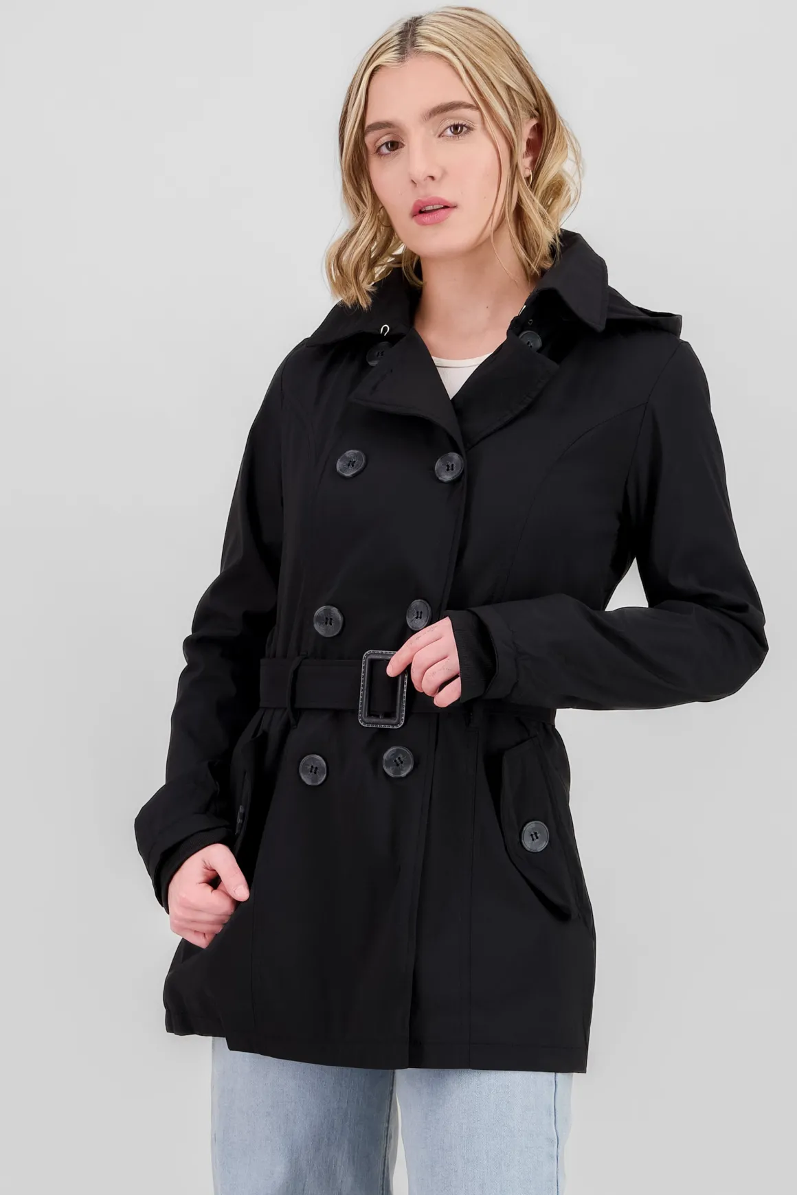 Esta gabardina monocolor es la prenda ideal que estabas buscando. Con un diseño corto y moderno, cuenta con un gorro que te protegerá con estilo. Los botones combinados a tono le dan un toque único, mientras que el cinturón ajustable resalta tu figura y agrega un detalle chic a tu look.