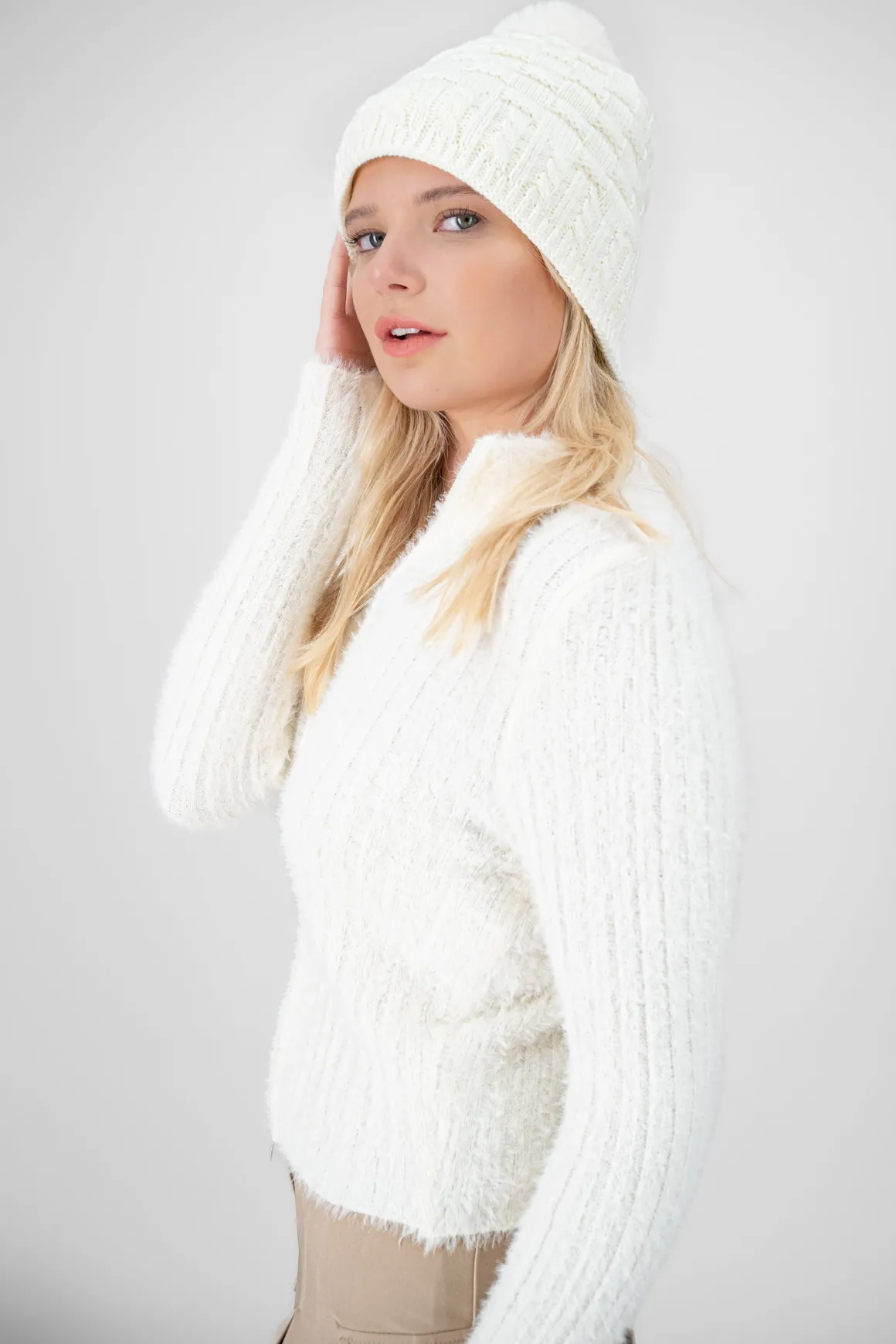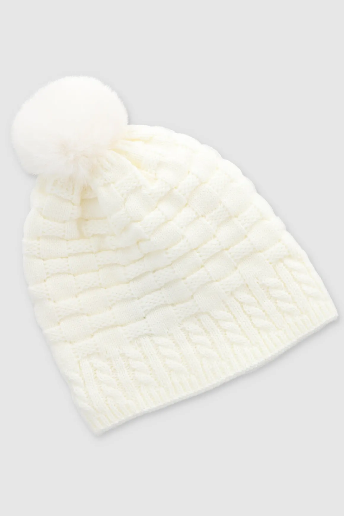 Gorro tejido con diseño de cuadros y borde acanalado. Pompón decorativo.
