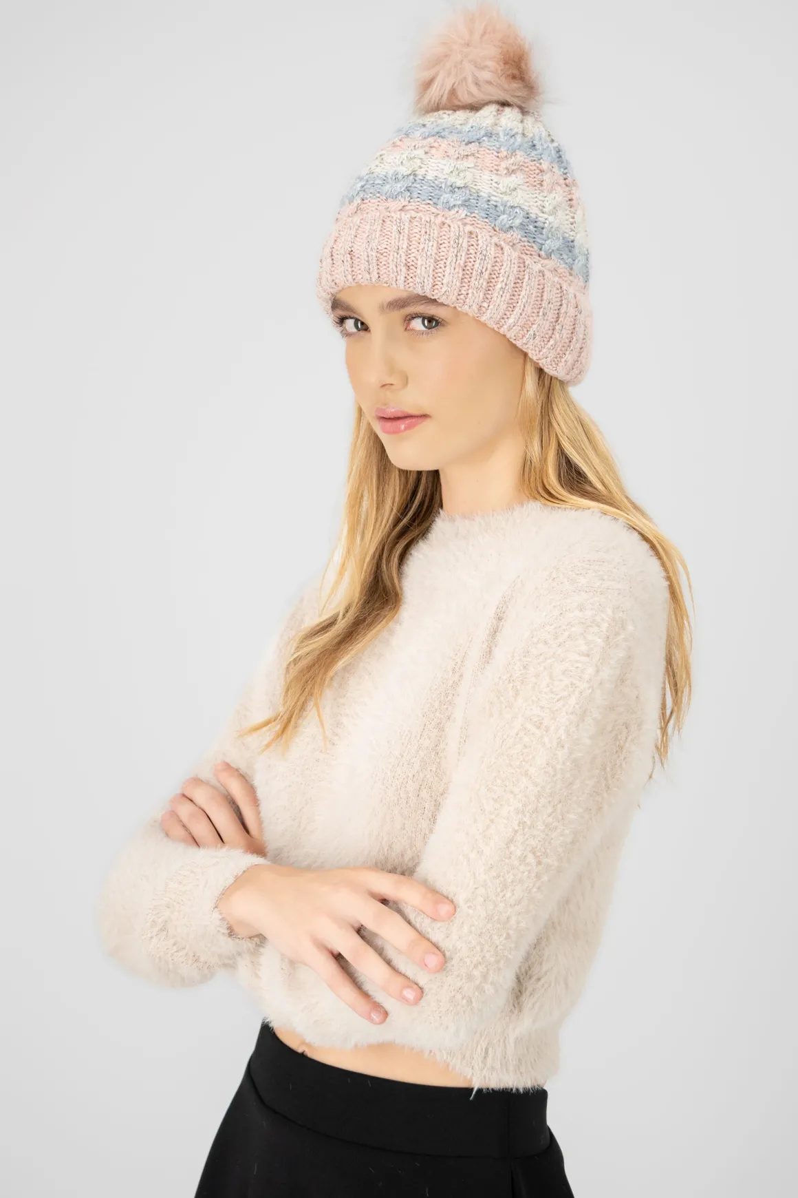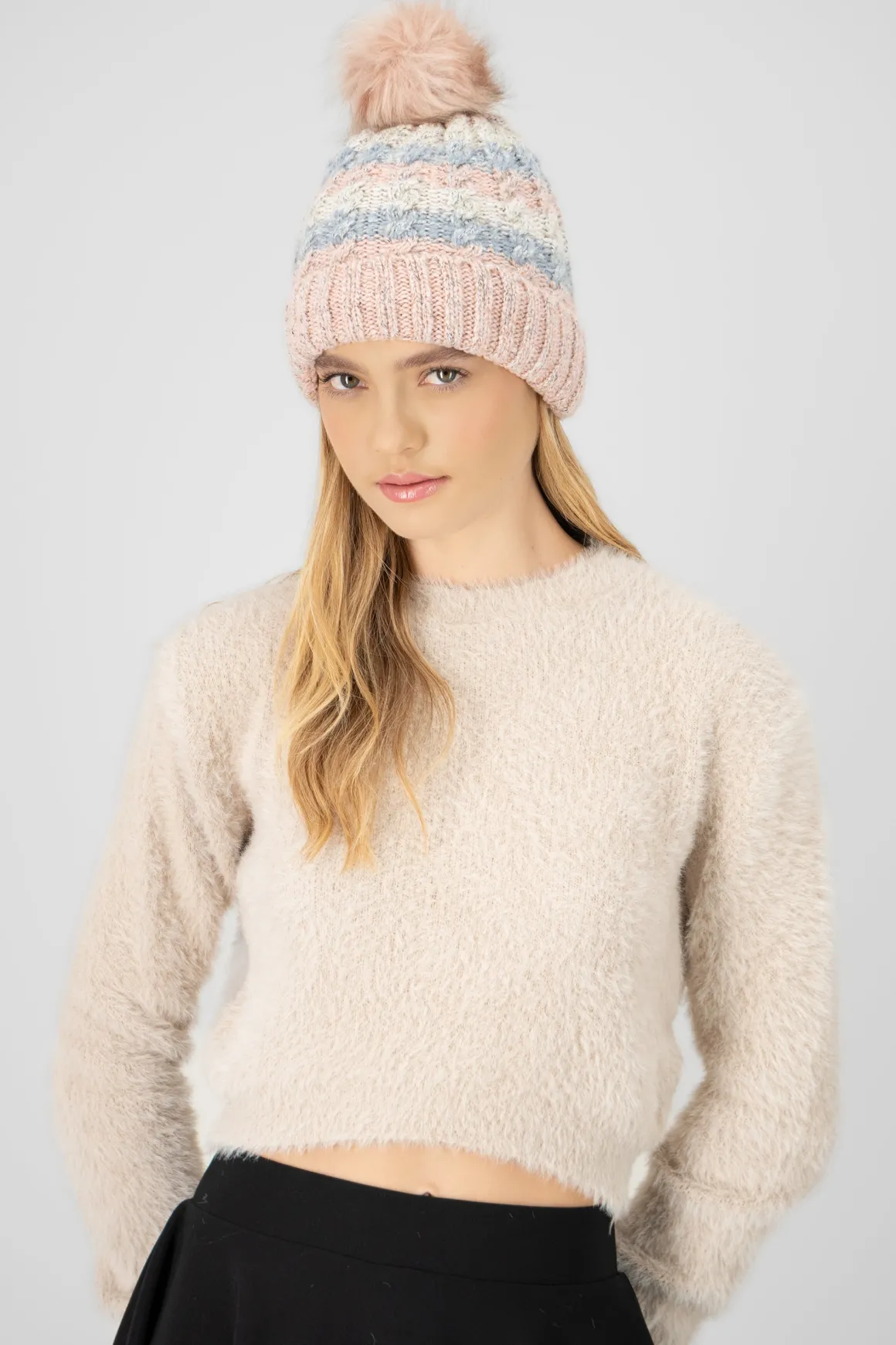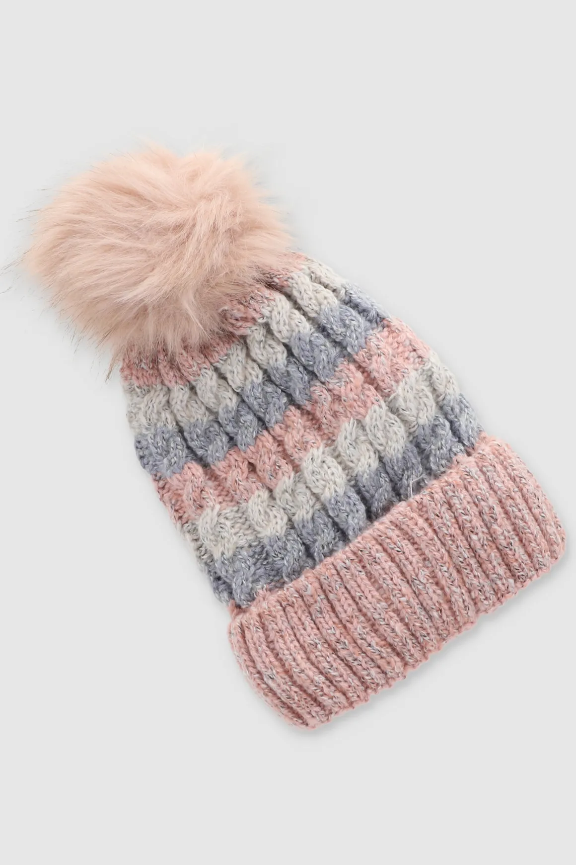 Gorro suave tejido acanalado con bola de peluche suave. Diseño multicolor.
