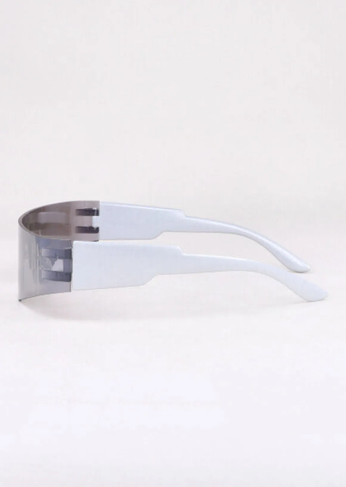 Lentes deportivos delgados con mica espejo, almohadillas transparentes y patas anchas.