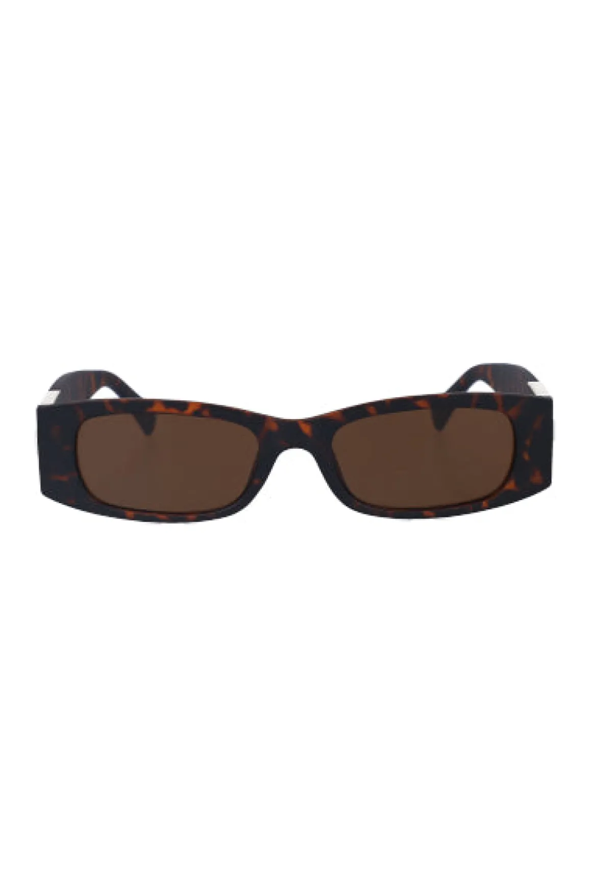 Lentes de sol semiredondos con mica oscura. Patilla ancha con detalle metálico.