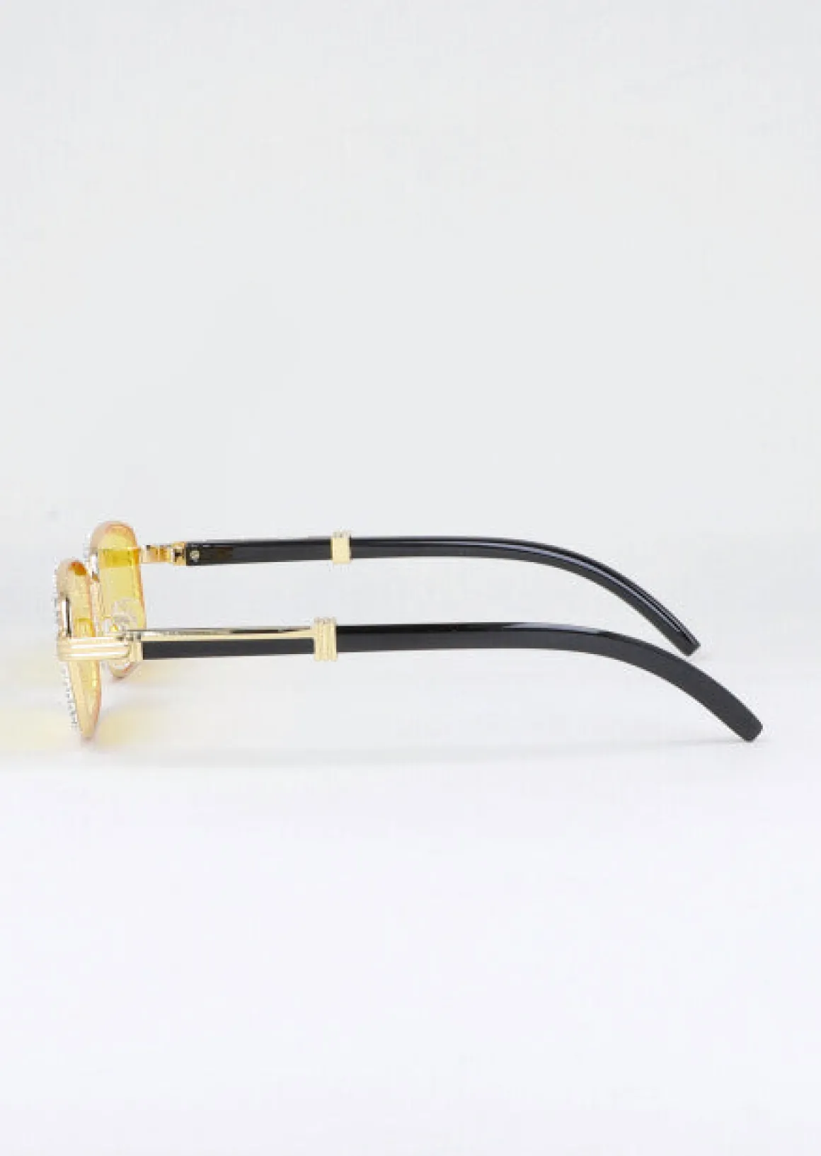 Lentes de sol cuadrados terminado metálico. Brillos incrustados en contorno y puente. Patillas de acrílico aplicaciones en dorado..