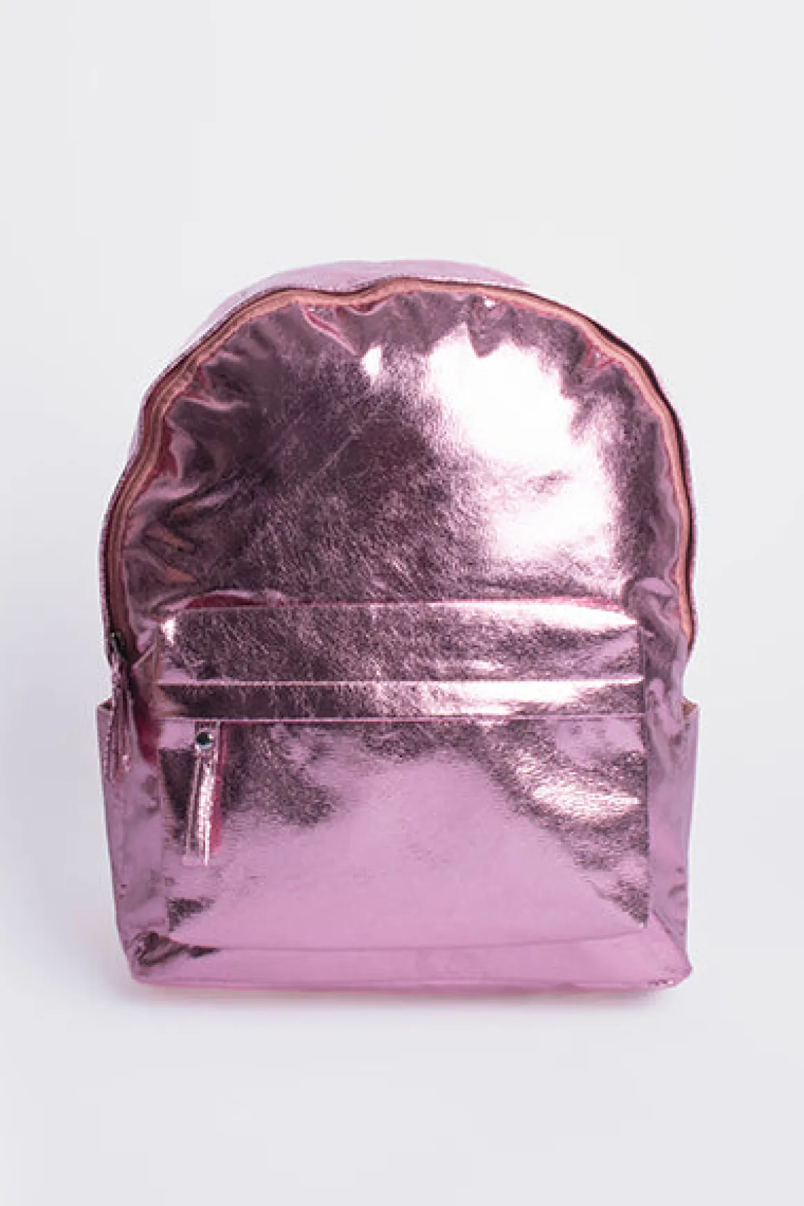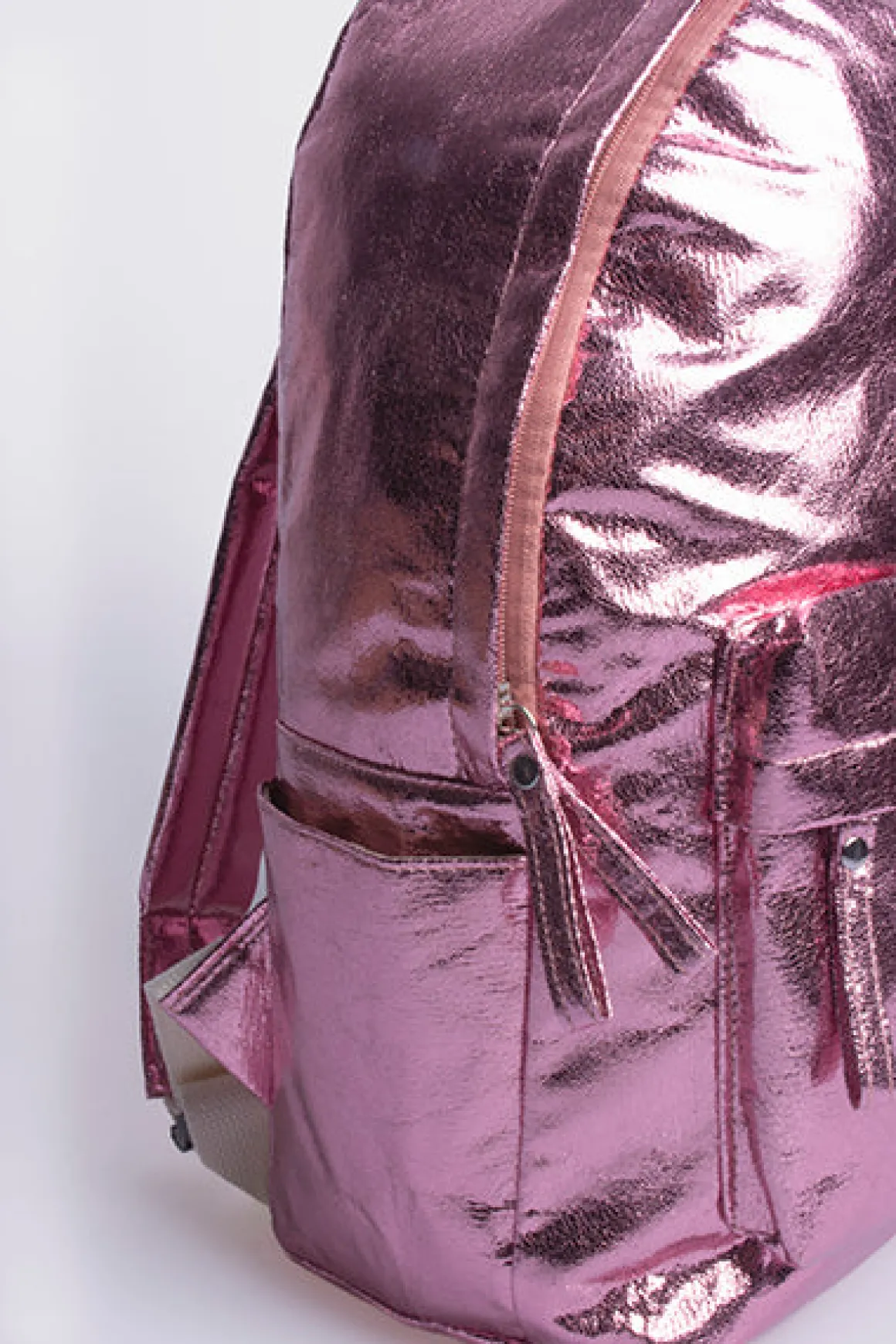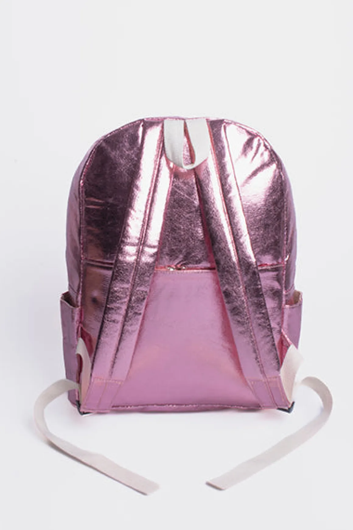 Mochila metalizada con bolsillo superior y delantero. Cintas con ajuste. Cierre mediante cremallera..