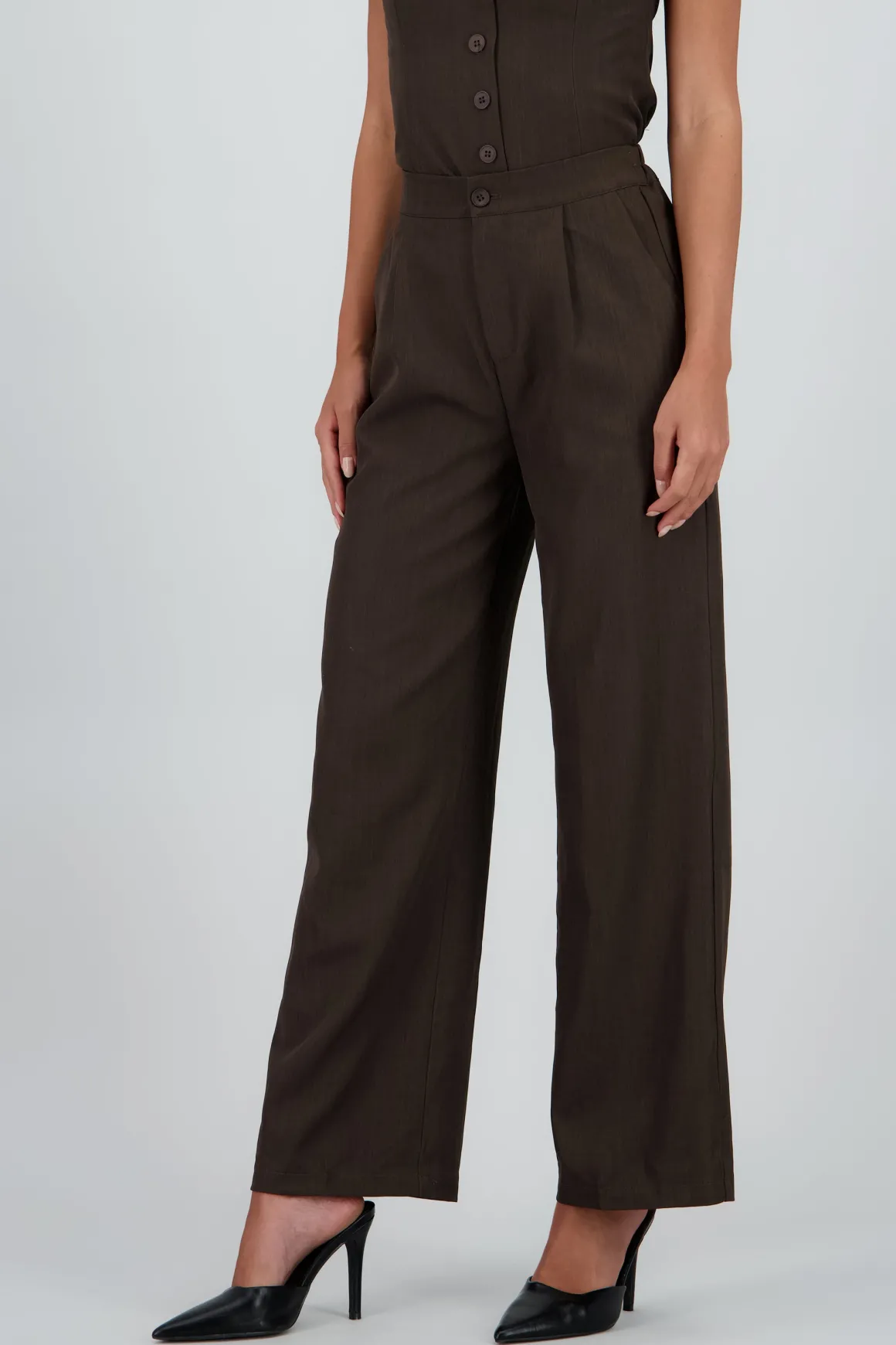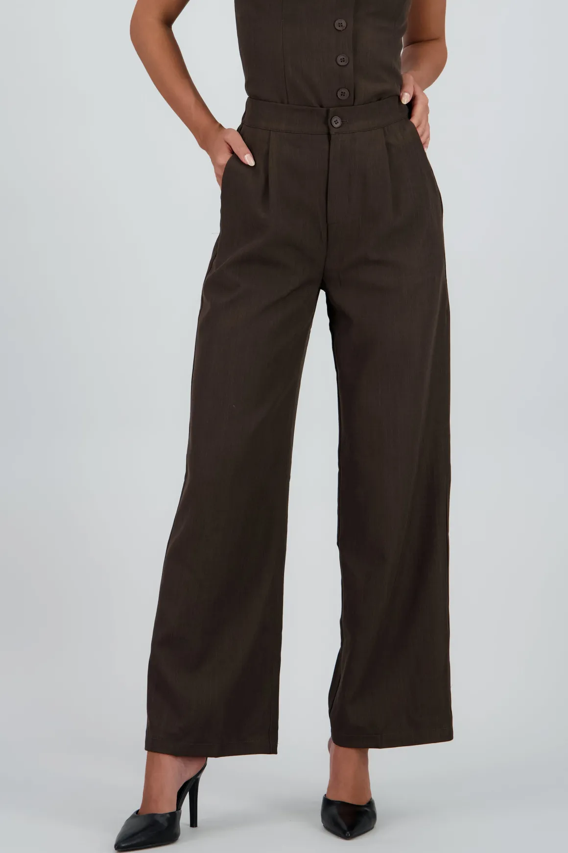 Pantalón recto con botón, corte clásico, cintura alta y bolsas laterales.