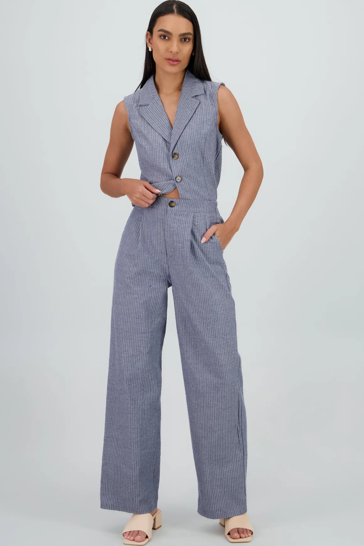 Pantalón sastre con diseño de rayas delgadas, corte recto, cintura alta y bolsillos laterales.