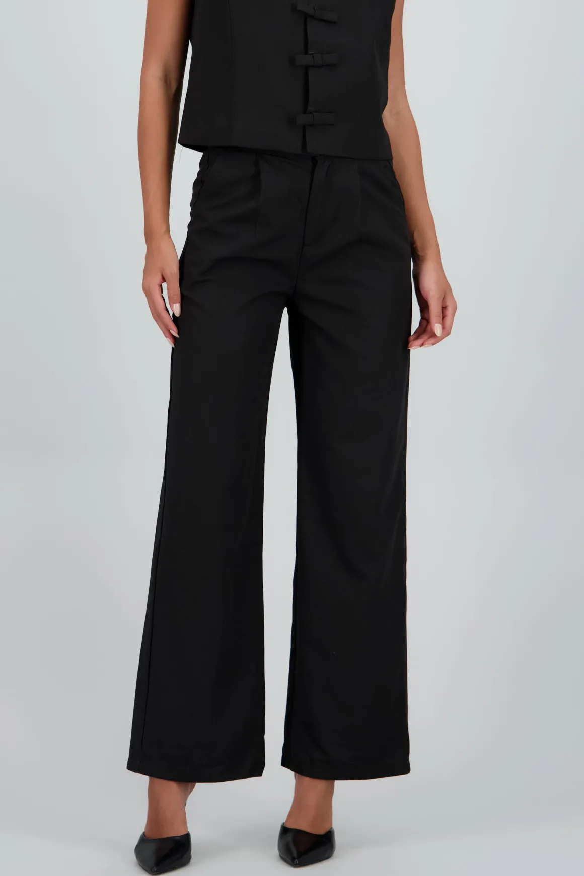 Pantalón sastre wide leg, corte amplio, cintura alta y detalle de pinzas.