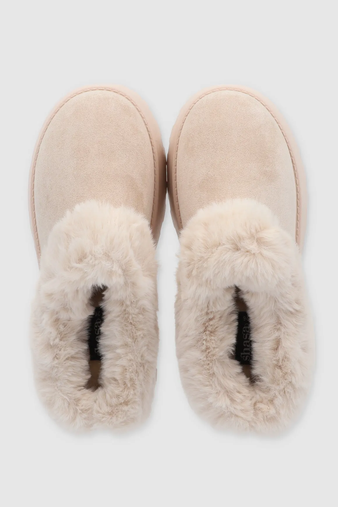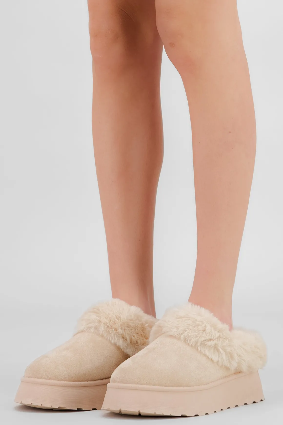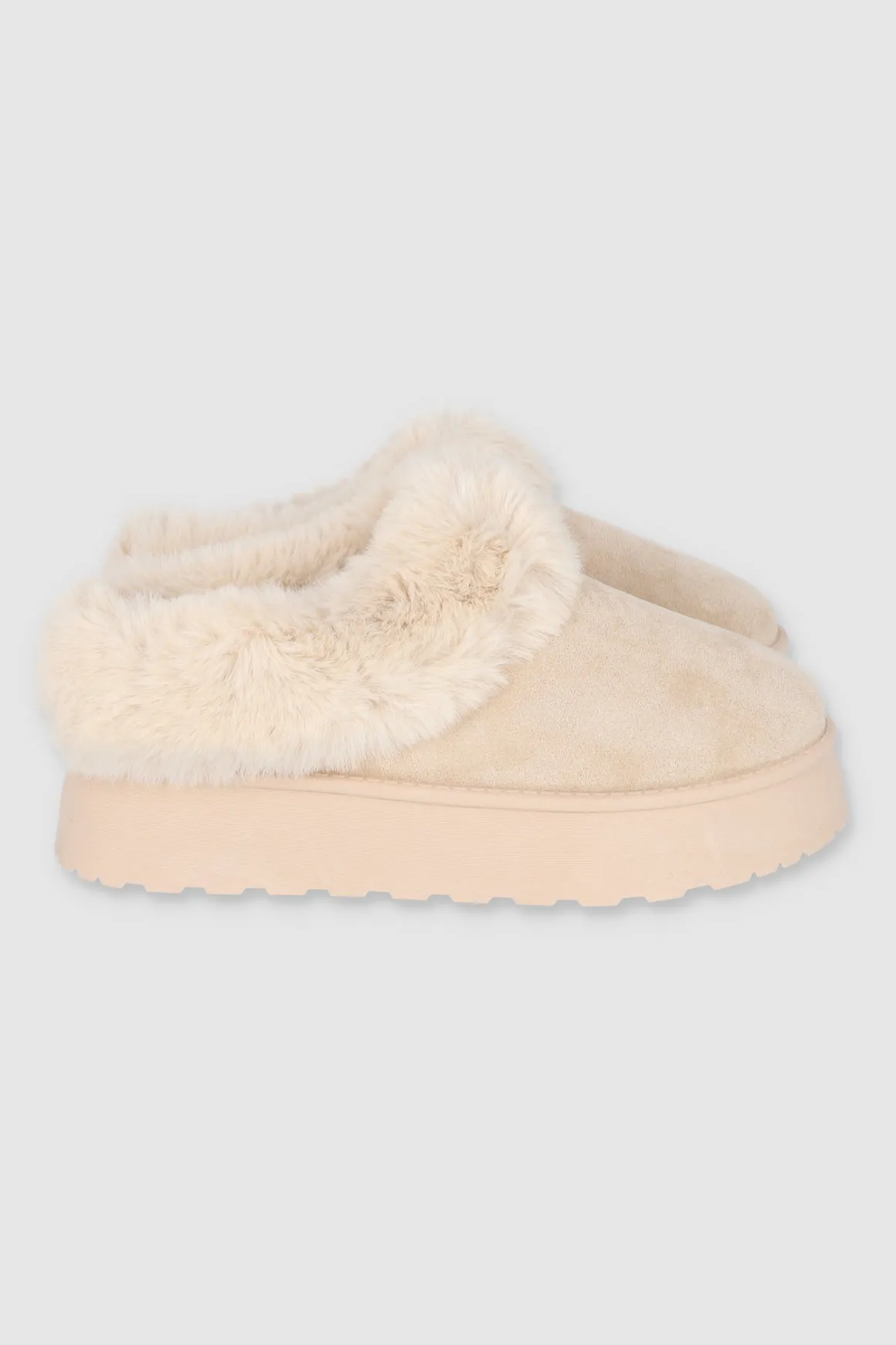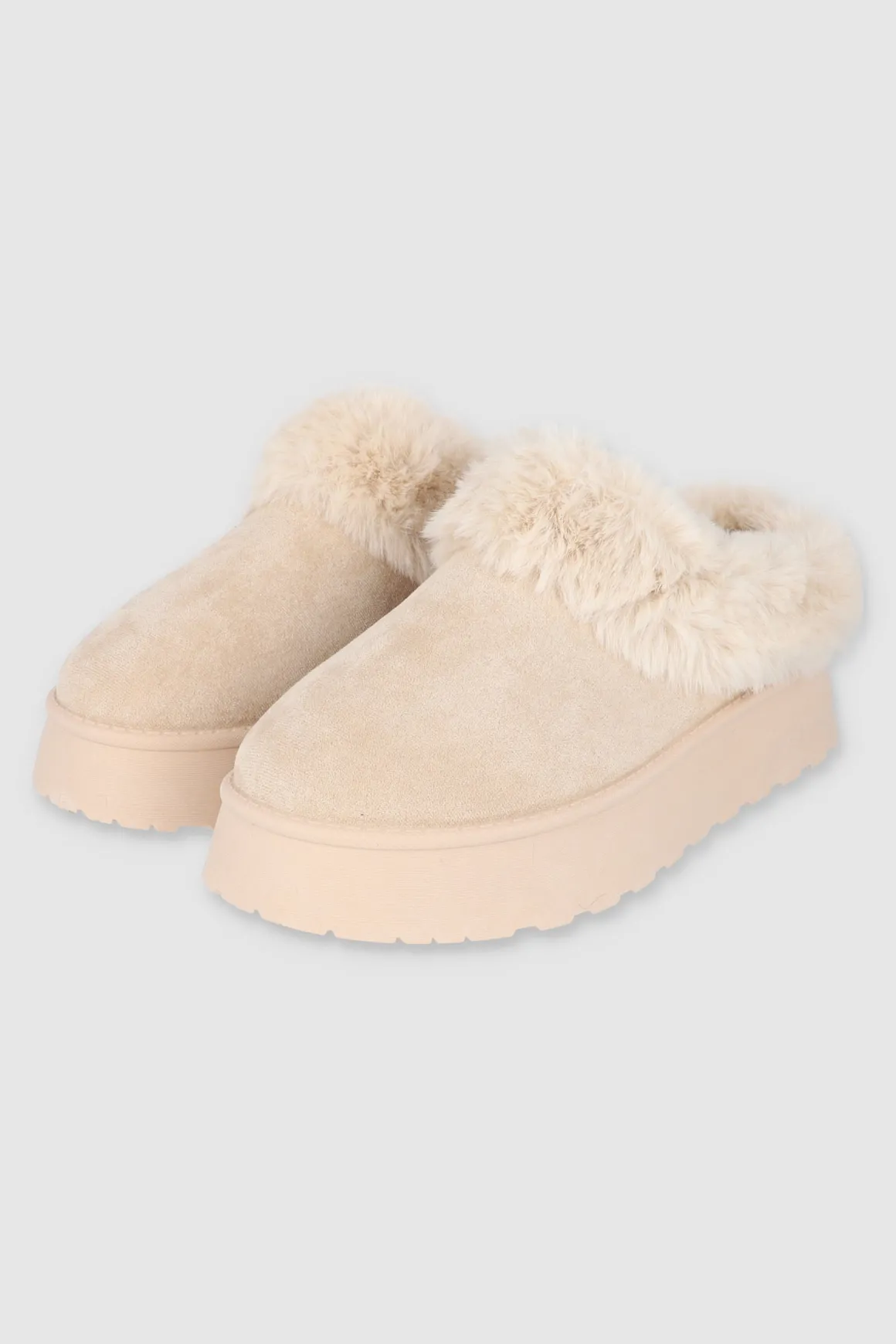 Estas pantuflas con plataforma y borde de peluche son ideales para mantener los pies cómodos y abrigados en casa.