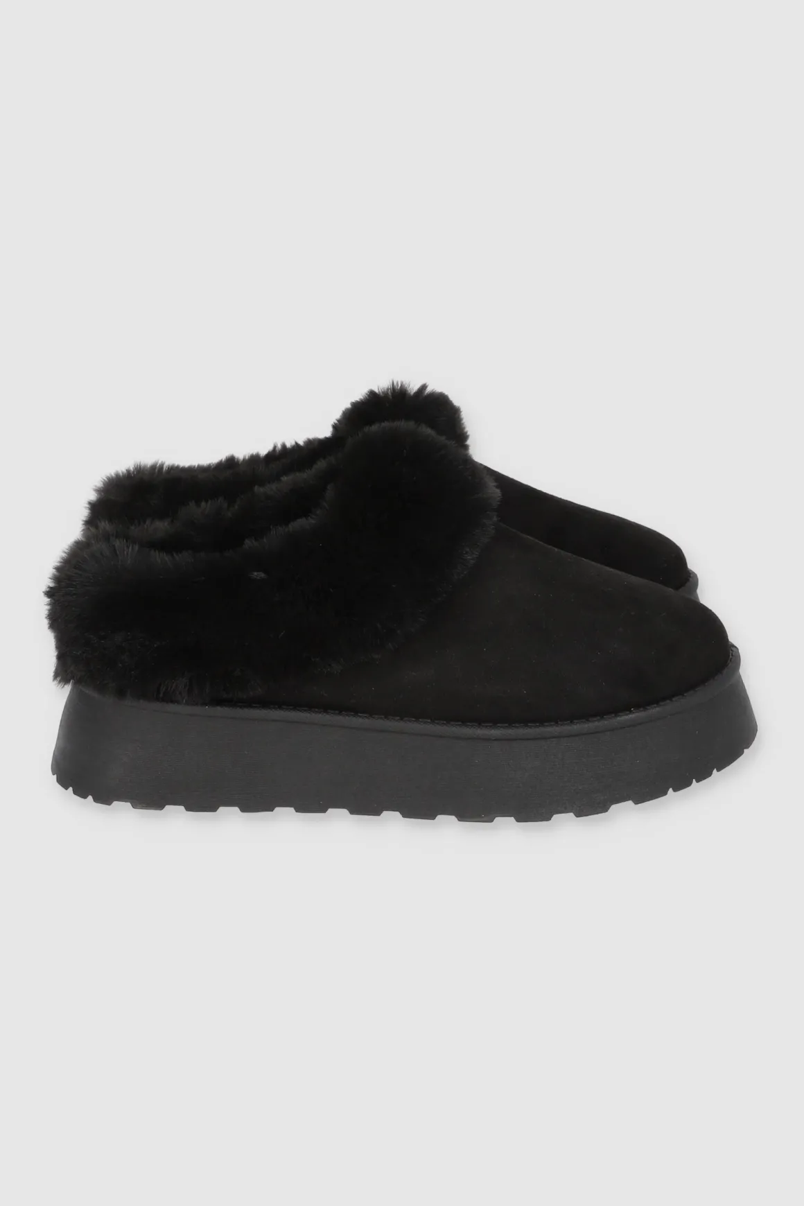 Estas pantuflas con plataforma y borde de peluche son ideales para mantener los pies cómodos y abrigados en casa.