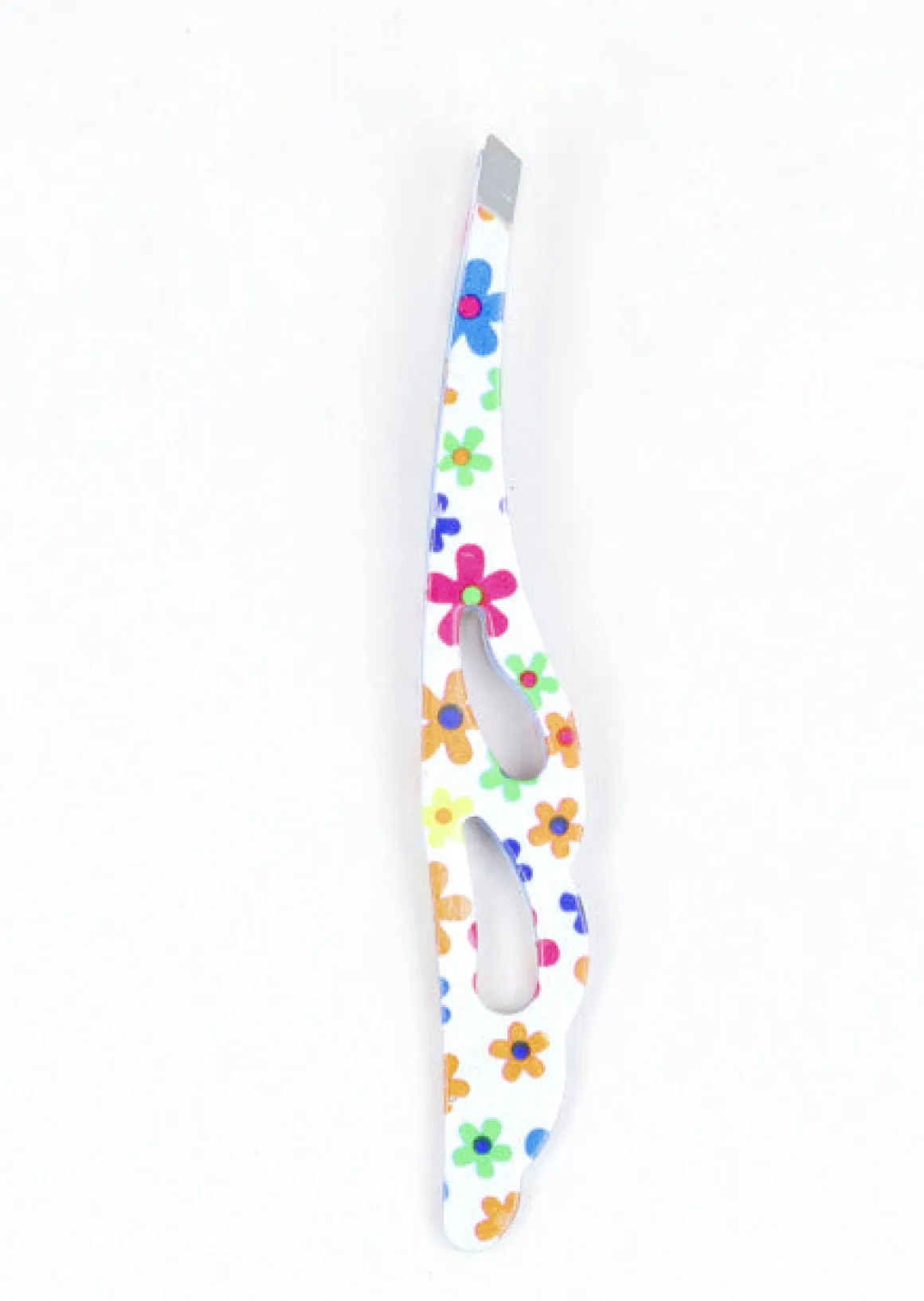 Pinza para depilar metálica. Con diseño para sujetar y estampado de flores.