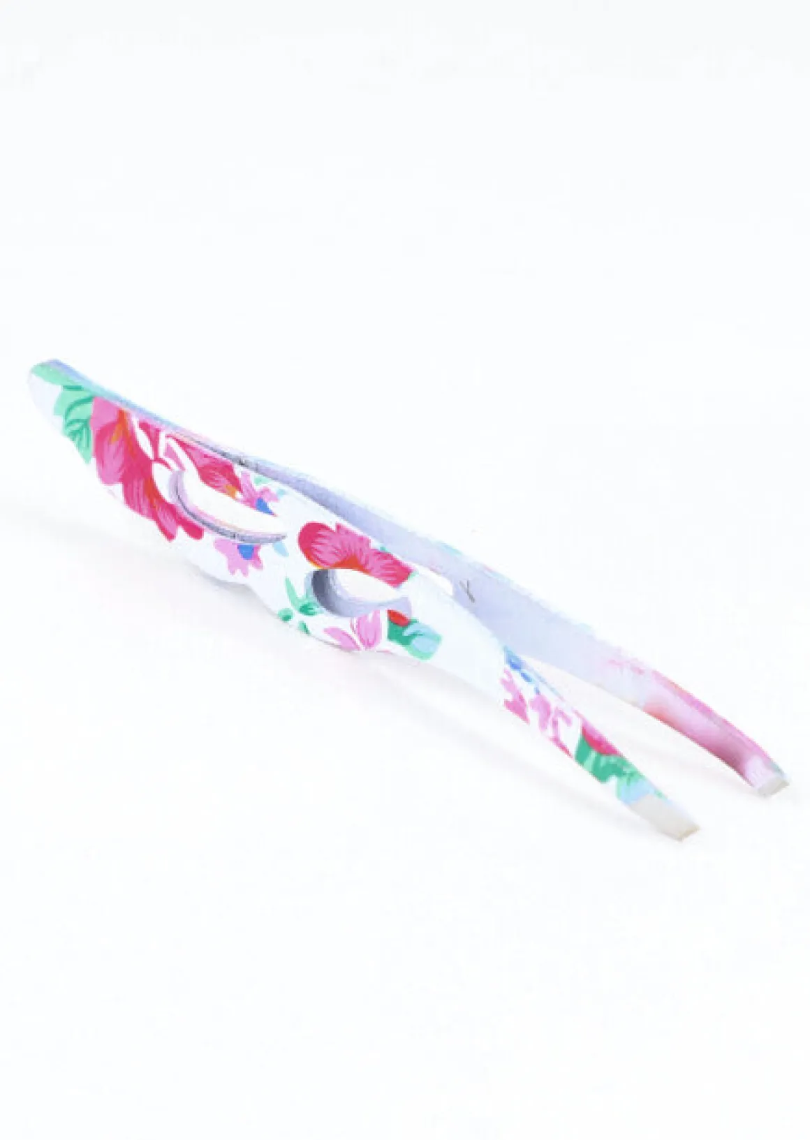 Pinza para depilar metálica. Con diseño para sujetar y estampado de flores.