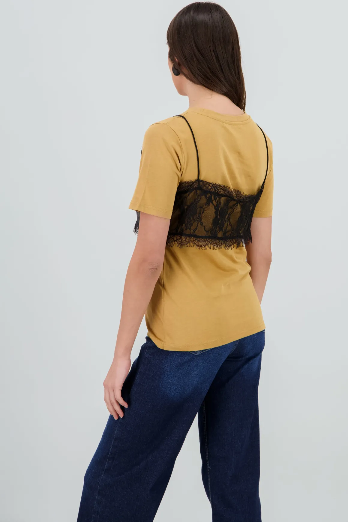 Perfecta para esos días donde quieres estar cómoda pero con estilo, esta playera se adapta a cualquier ocasión. Con un toque de encaje que le da un giro especial, es ideal para crear outfit únicos y llenos de personalidad.