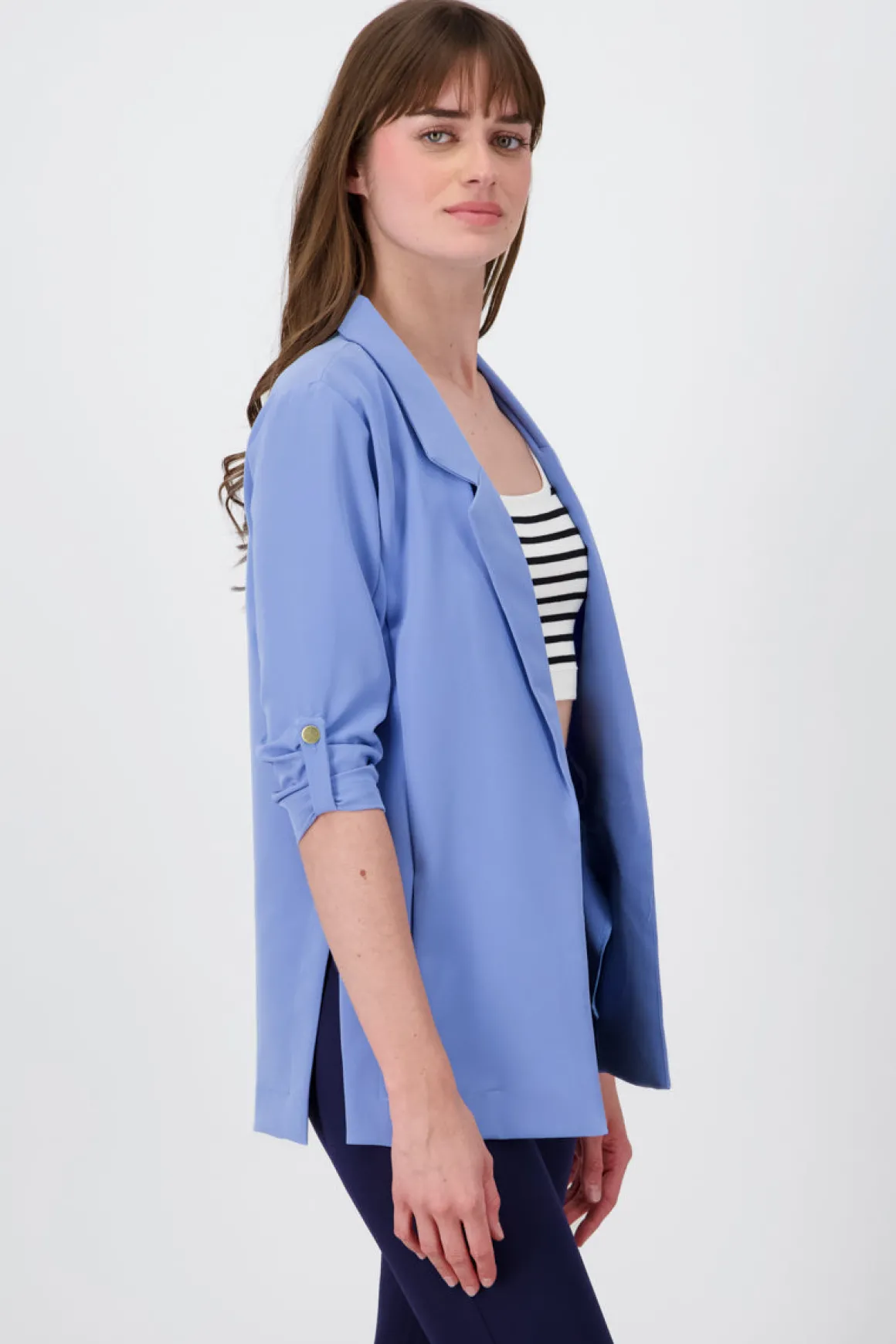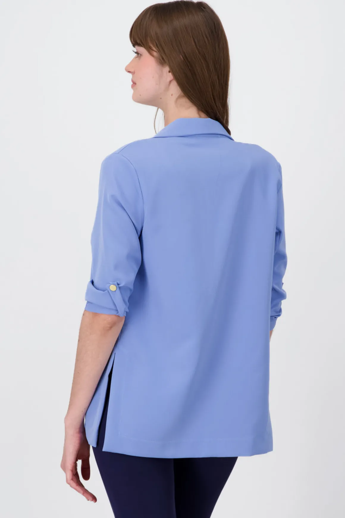 Este increíble saco liso presenta un cuello solapa y bolsillos discretos en la parte frontal para un estilo formal. Destacando por sus aberturas laterales en el borde inferior, este saco ofrece un toque moderno y versátil. Sus mangas 3/4 vienen con elevadores y botones metálicos, agregando un detalle lindo a tu outfit.