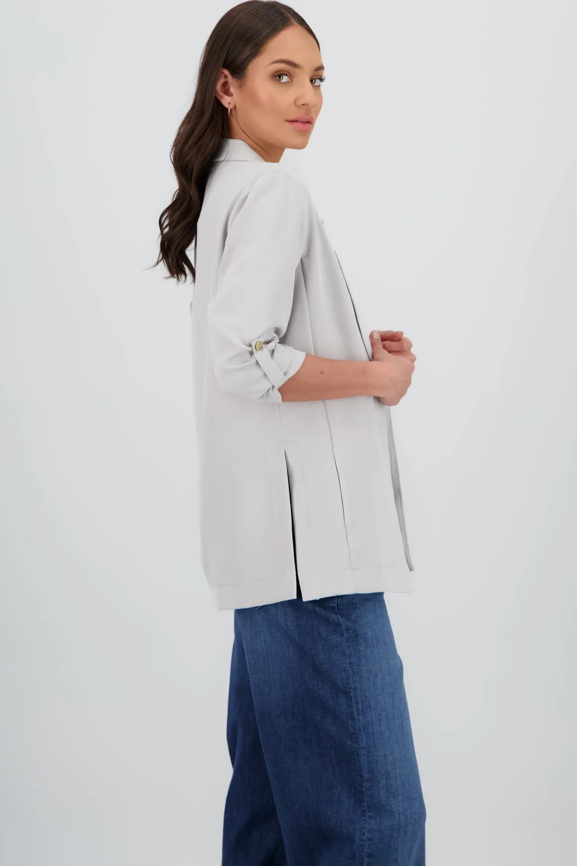Este increíble saco liso presenta un cuello solapa y bolsillos discretos en la parte frontal para un estilo formal. Destacando por sus aberturas laterales en el borde inferior, este saco ofrece un toque moderno y versátil. Sus mangas 3/4 vienen con elevadores y botones metálicos, agregando un detalle lindo a tu outfit.