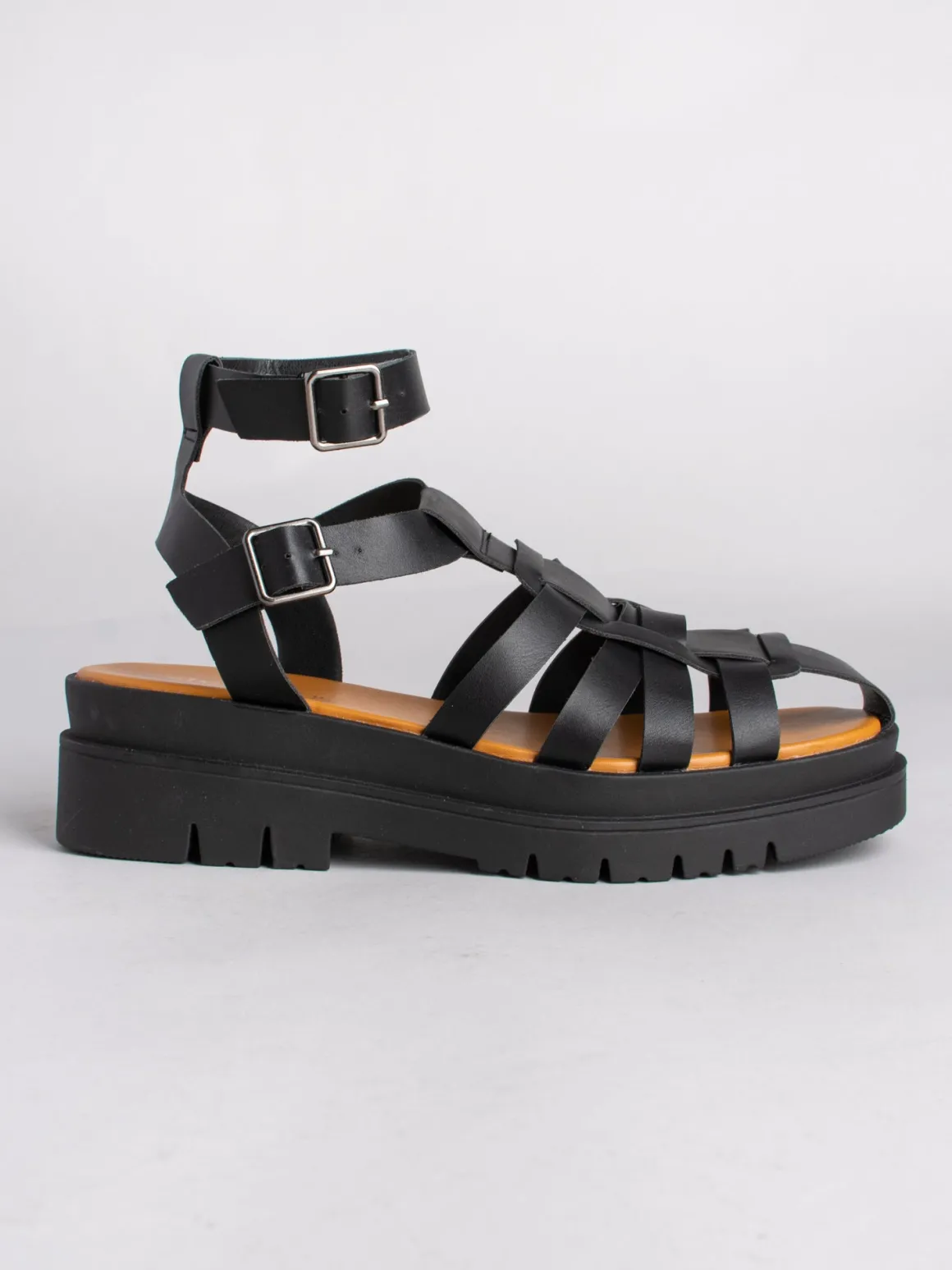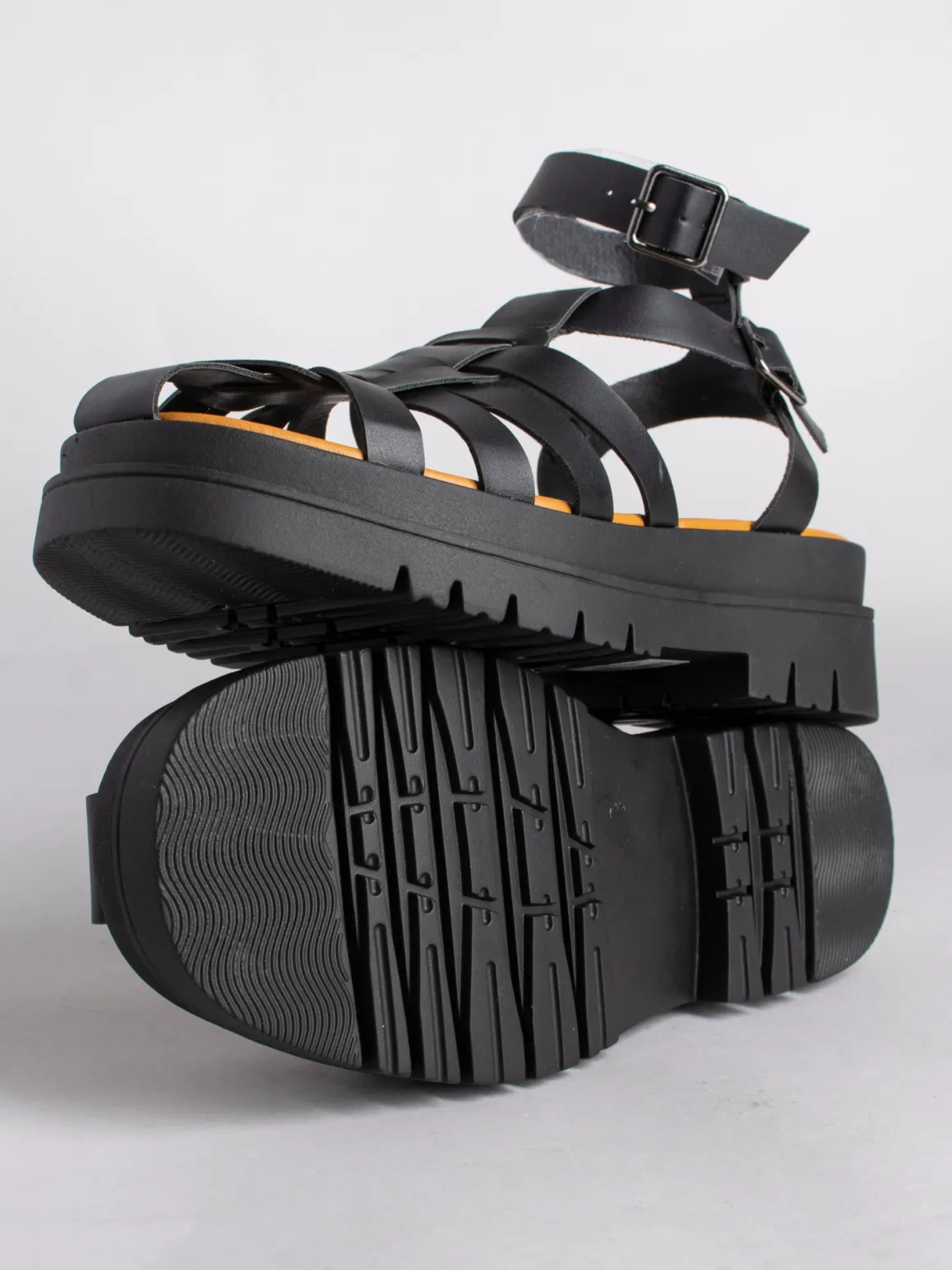 Sandalia cangrejera de plataforma con suela track. Cierre mediante pulseras al tobillo.