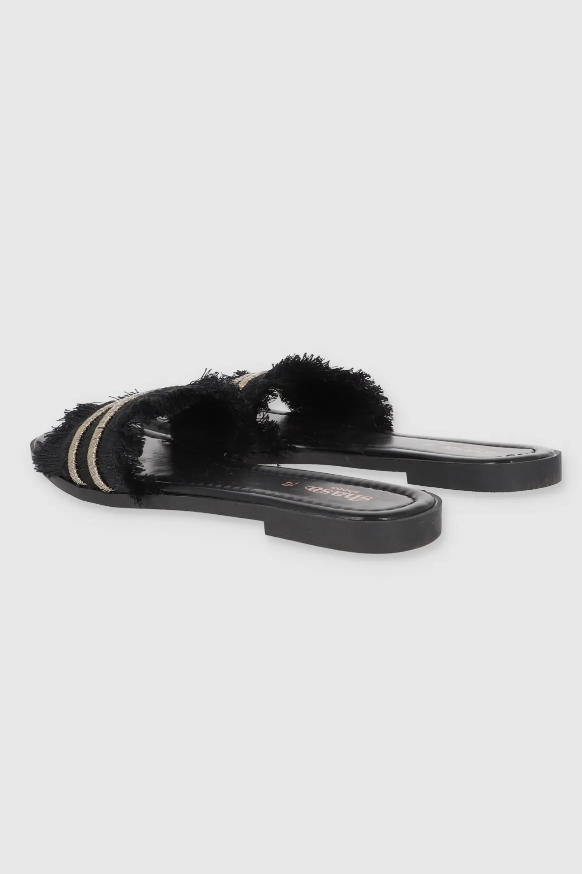 Dale un toque cool a tu outfit con nuestras sandalias planas, perfectas para cualquier plan. Estas sandalias tienen una cinta ancha superior que aporta comodidad y estilo. Los bordes de la cinta están decorados con detalles de flecos que le dan un toque boho, mientras que la tira doble de brillos añade un toque chic y llamativo. Combínalas con tus jeans favoritos o un vestido de verano.