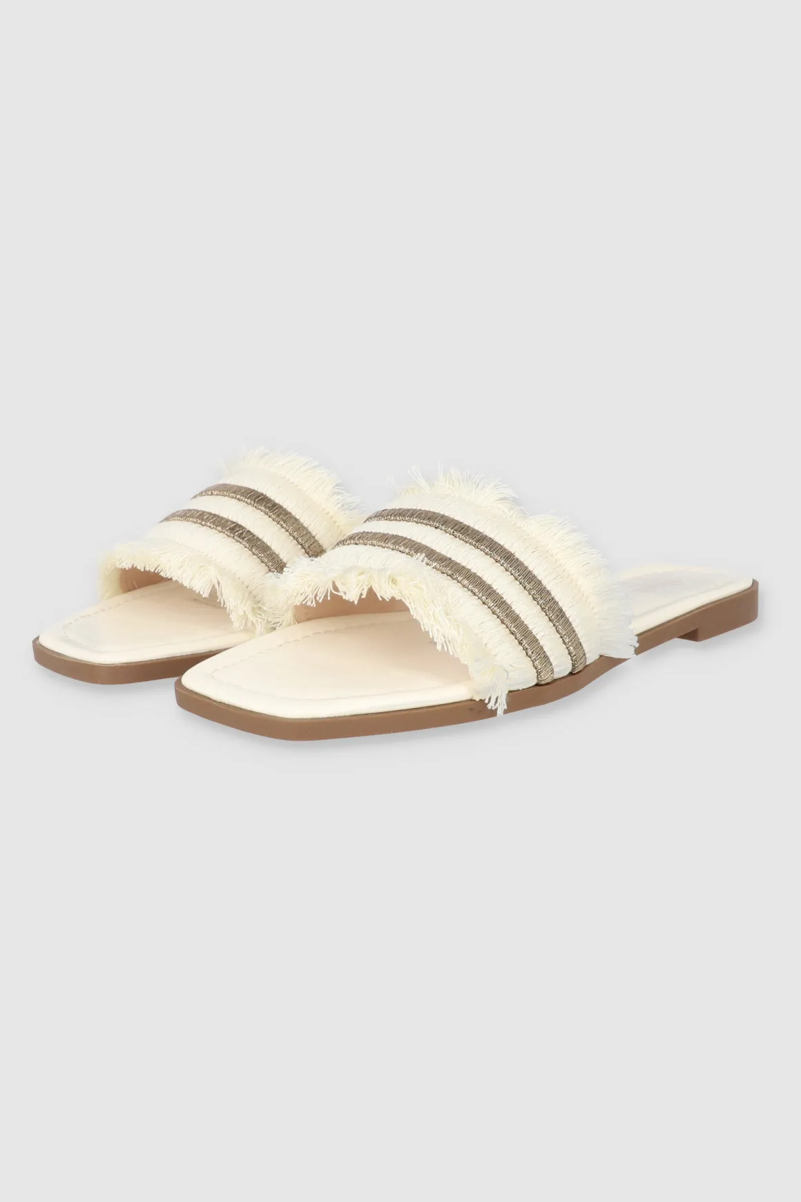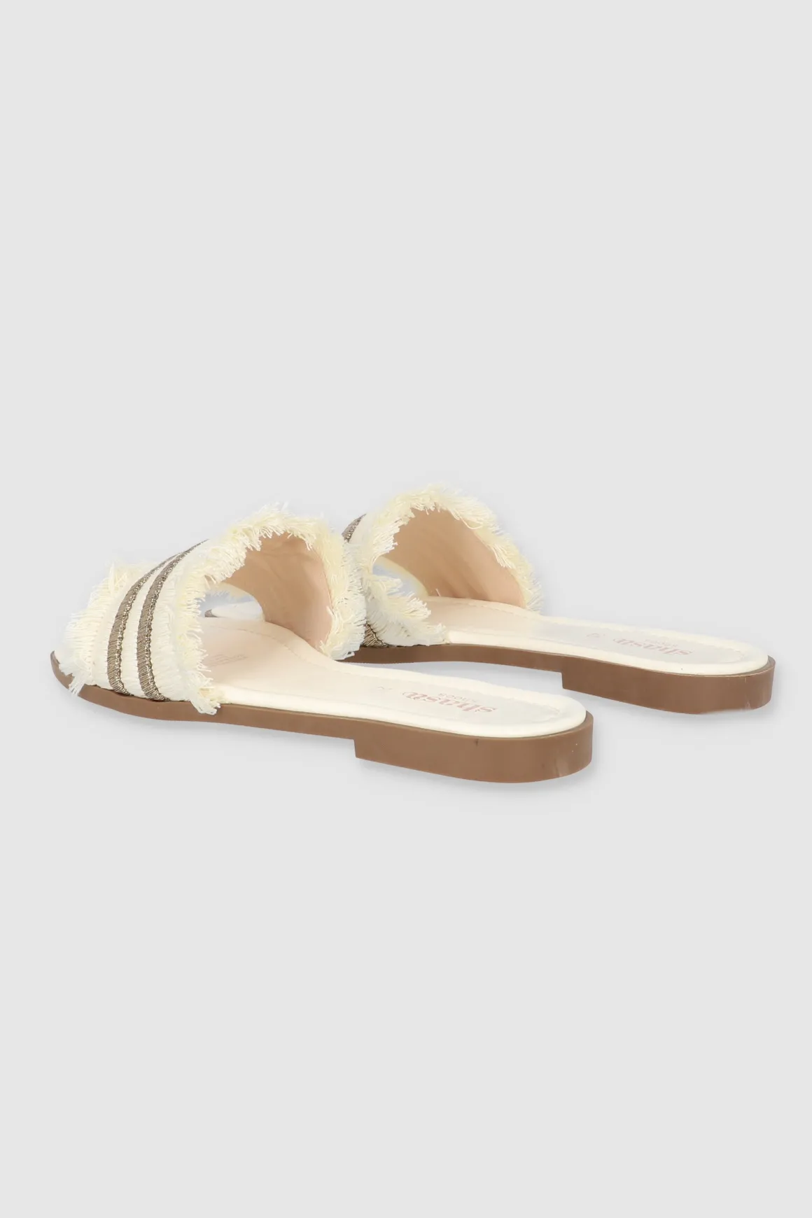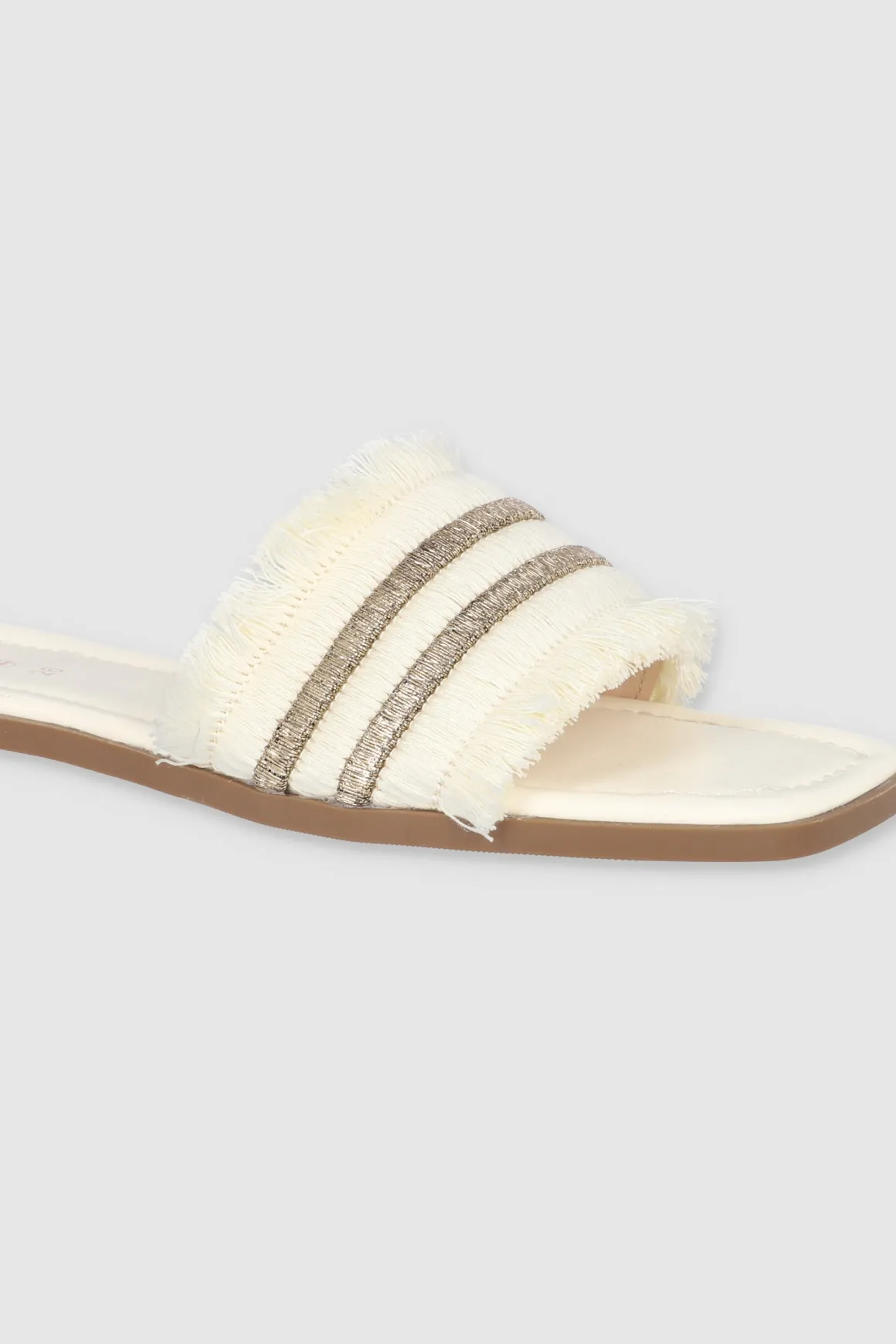 Dale un toque cool a tu outfit con nuestras sandalias planas, perfectas para cualquier plan. Estas sandalias tienen una cinta ancha superior que aporta comodidad y estilo. Los bordes de la cinta están decorados con detalles de flecos que le dan un toque boho, mientras que la tira doble de brillos añade un toque chic y llamativo. Combínalas con tus jeans favoritos o un vestido de verano.