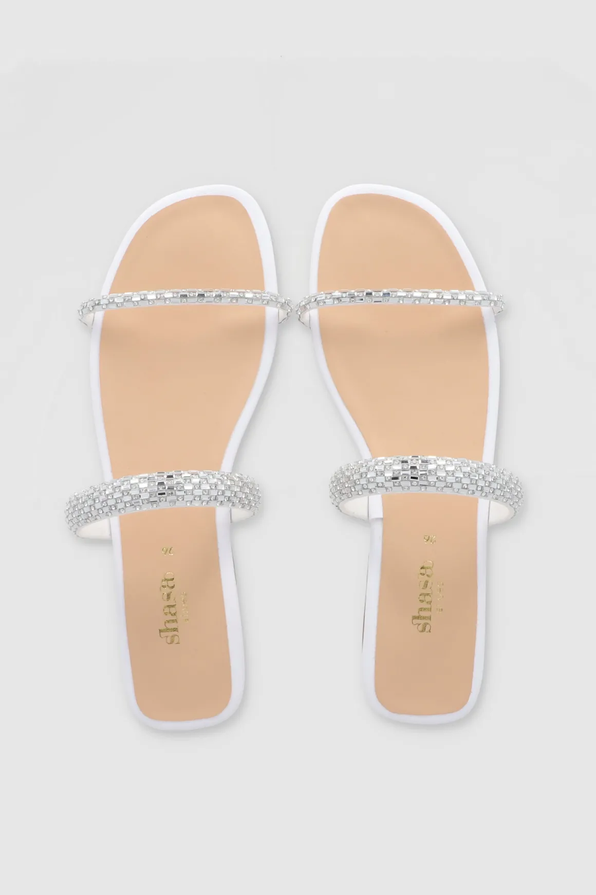 - Dos tiras adornadas con grandes brillos circulares y rectangulares para un toque deslumbrante.