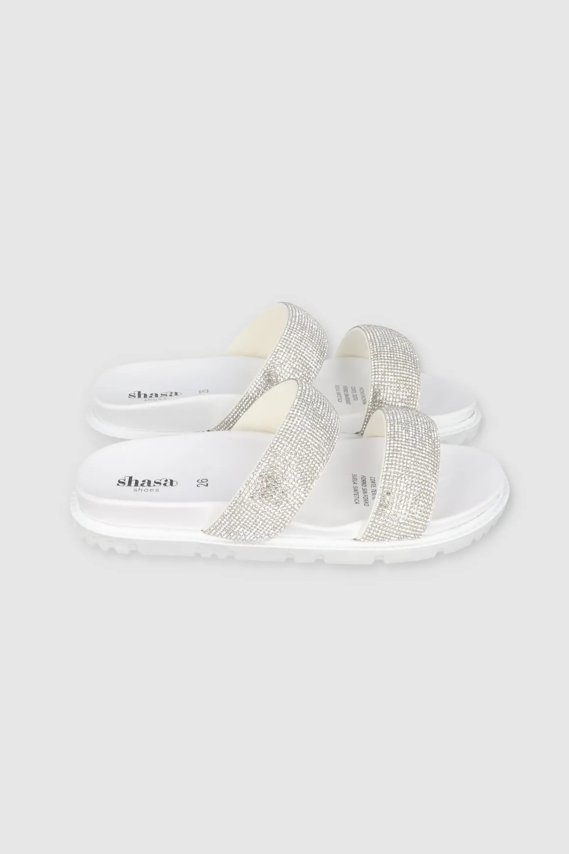 Estas sandalias lisas están diseñadas con una doble cinta superior que agrega un toque a tu atuendo. La aplicación de brillos le da un brillo sutil, perfecto para destacar en cualquier ocasión.