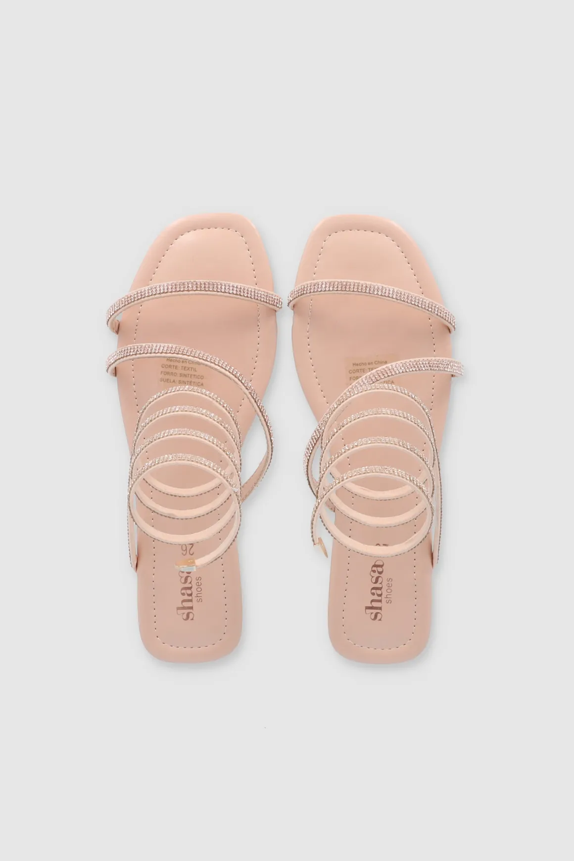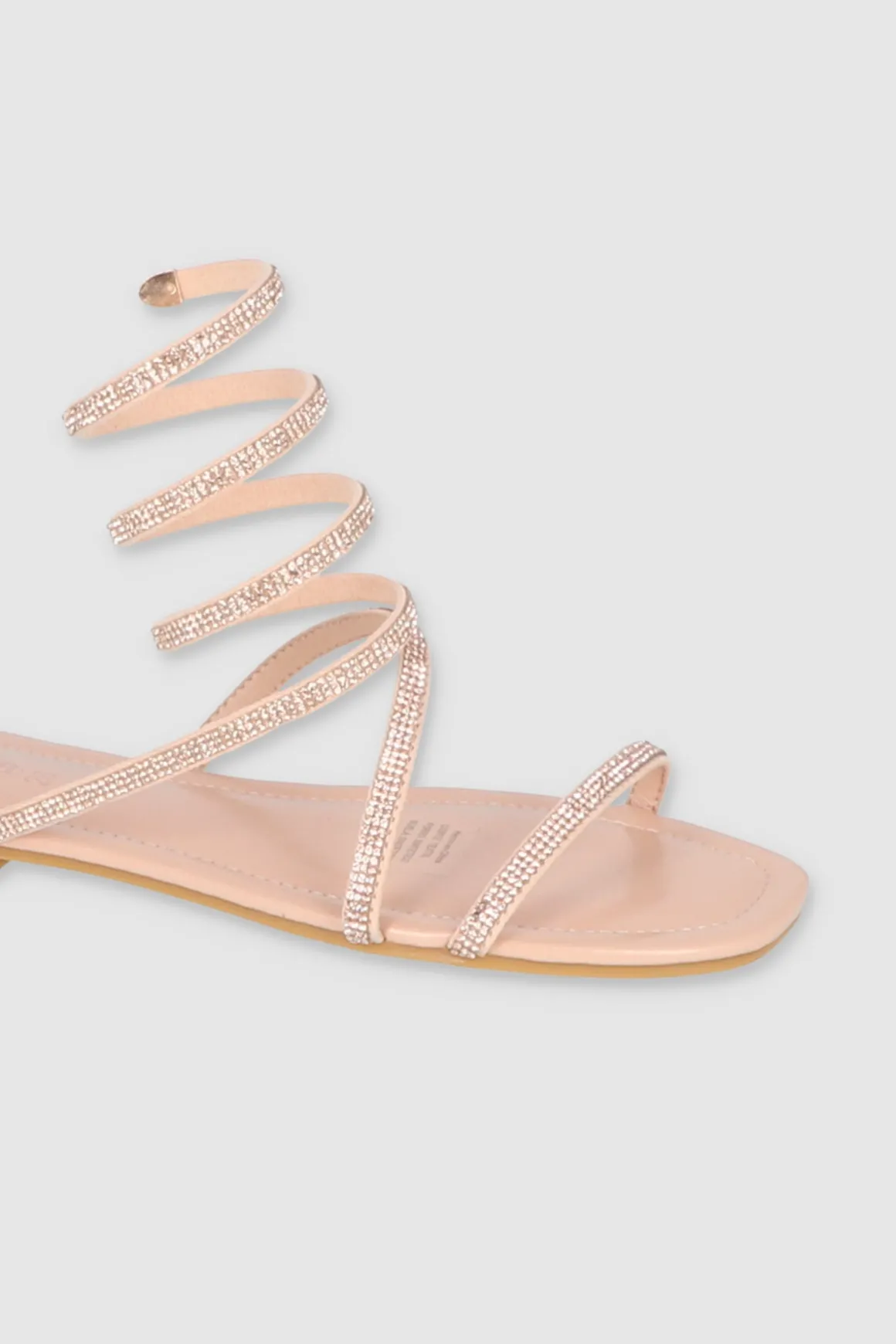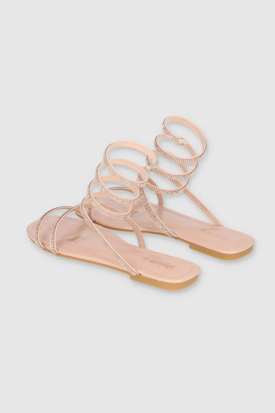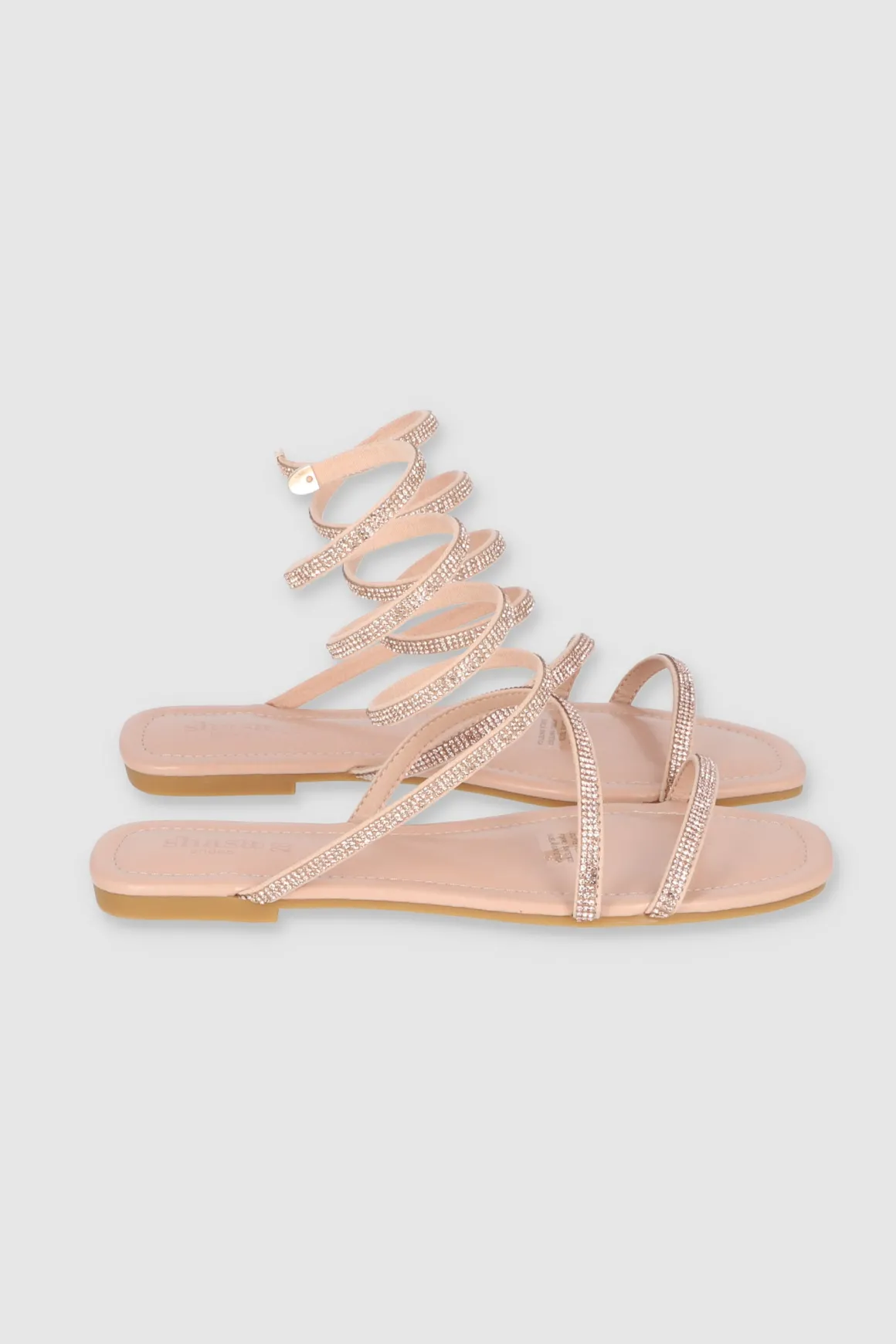 Luce espectacular con estas sandalias planas de cinta en espiral decorada con brillos. El diseño es ideal para darle ese toque glam a cualquier look casual. Son el complemento perfecto para días en los que quieres destacar sin perder la comodidad. ¡Con estas sandalias, tu estilo brilla con cada paso!
